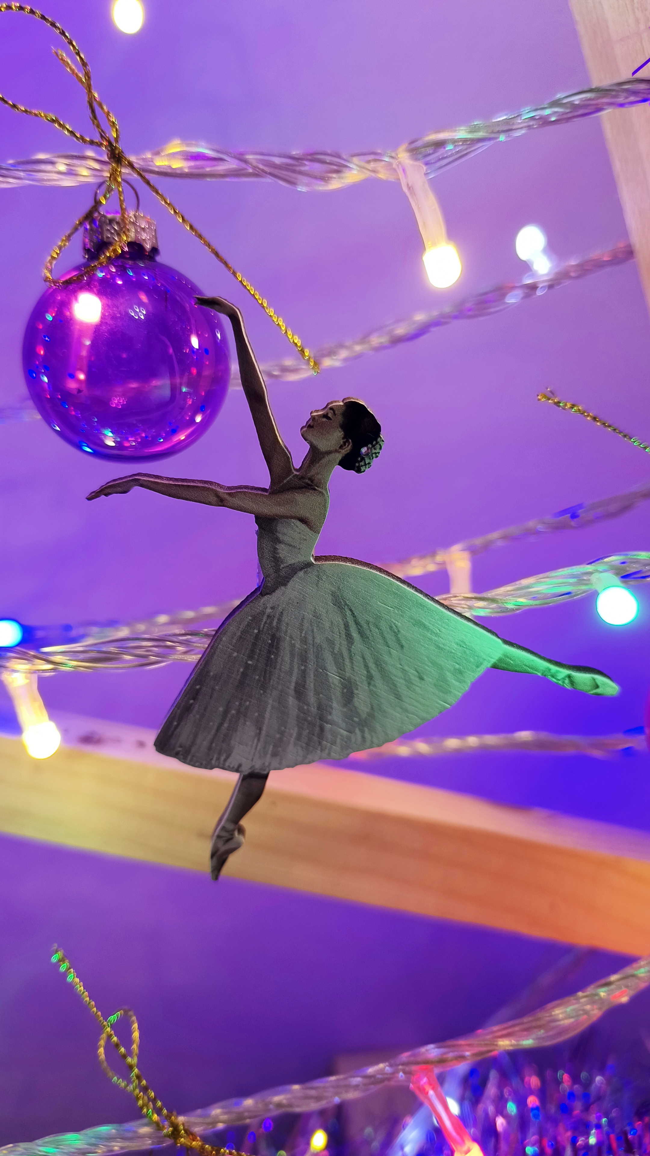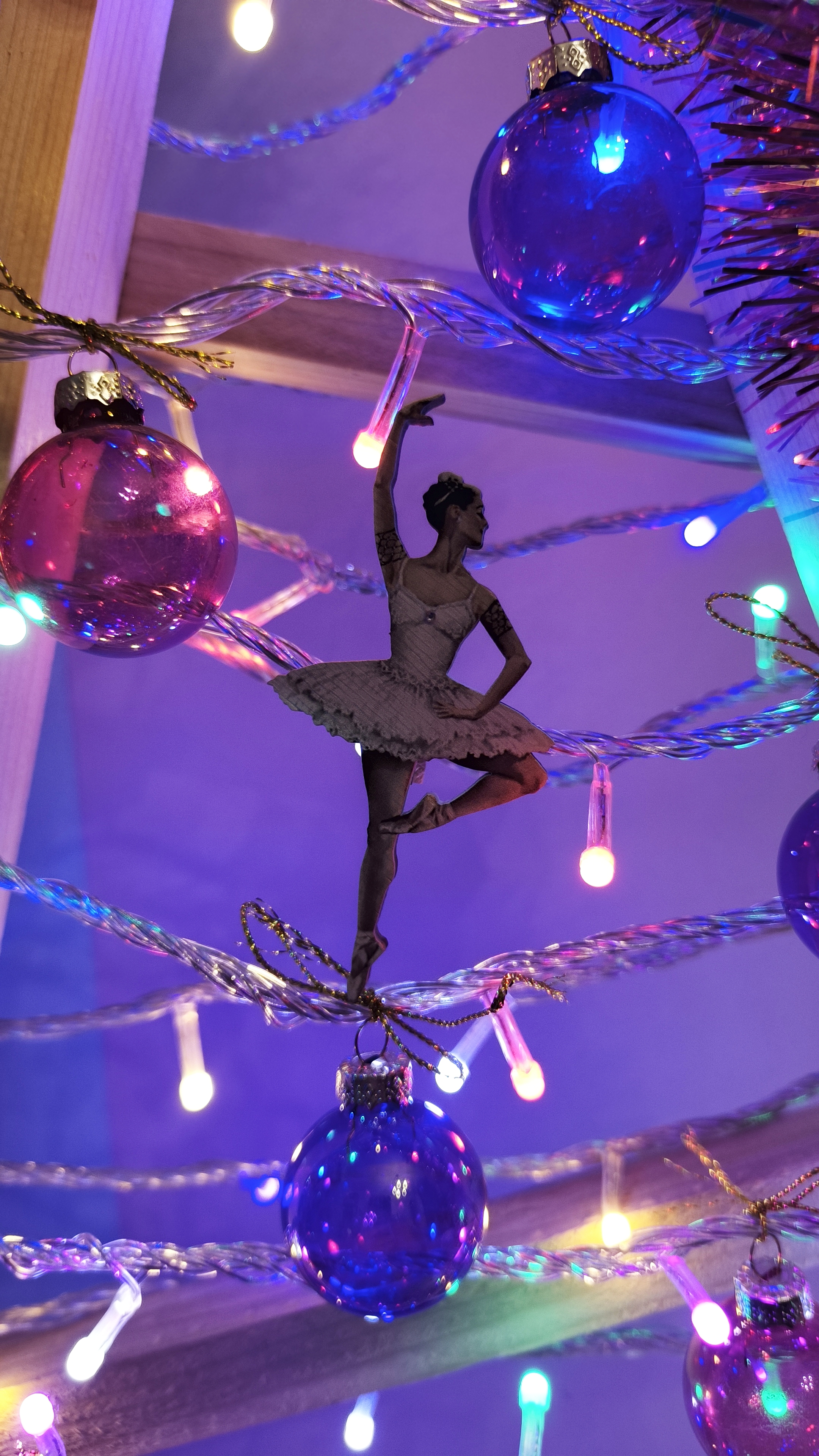 Елку ставим обычную, а деревянная по праву теперь Симина. Но люпытница все ж залезла внутрь и любуется шариками. Шарики, конечно же, привязаны.