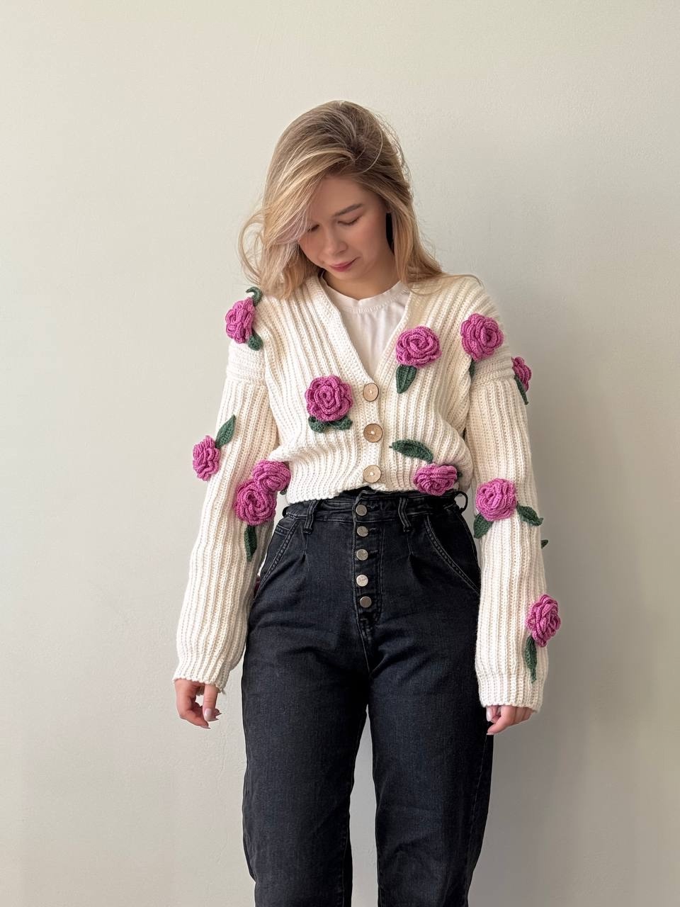 Кардиган из мериноса с цветами более 2.5 тыс. Пехорка элегантная выглядит эффектно! Но нельзя стирать — только химчистка.
