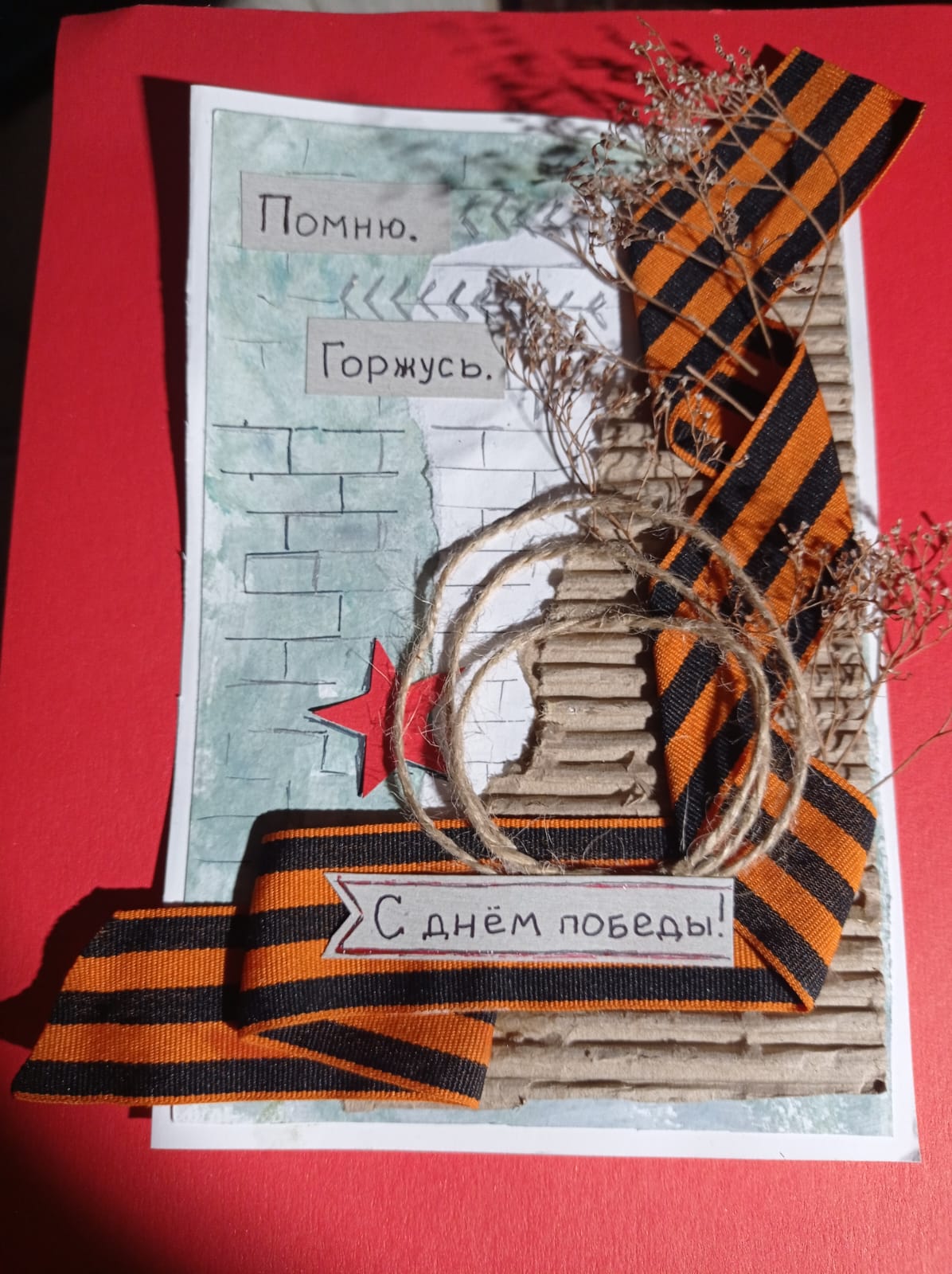 Дочь любит дарить учителю открытки, сделанные своими руками, и я решила ей помочь. Мы немного покрасили, нарисовали стены, небрежно приклеили кусочки бумаги и картона. Добавили георгиевскую ленту, немного декора и штрихов. Получилось красиво!