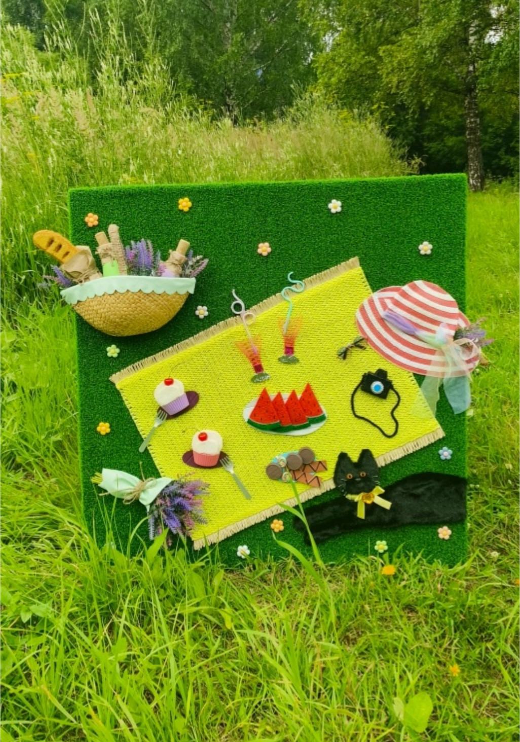 На листе бумаги размером с будущее панно нарисовала нужные предметы, вырезала и изготавливала по отдельности. Далеее просто собрала и приклеила согласно эскизу.