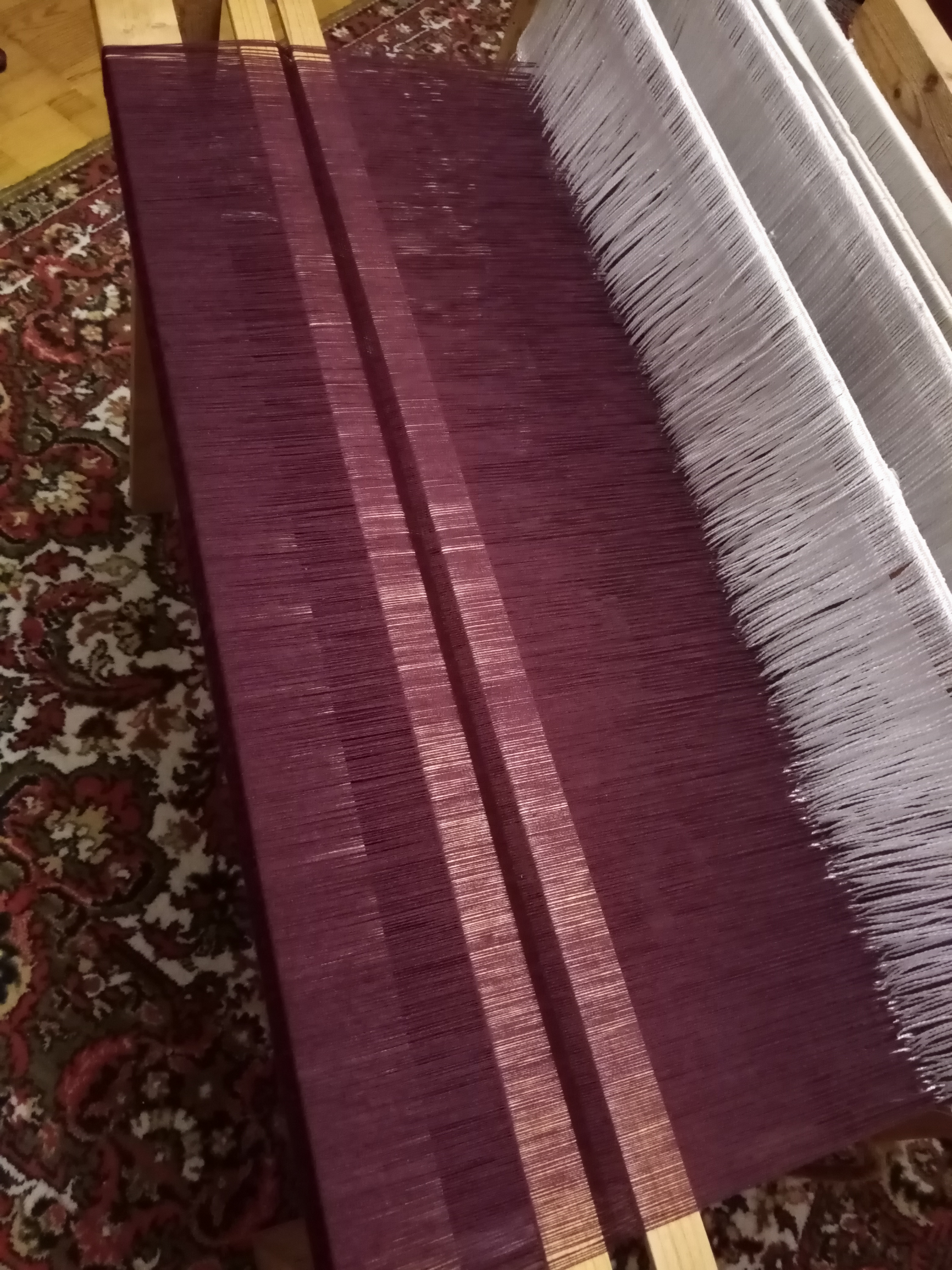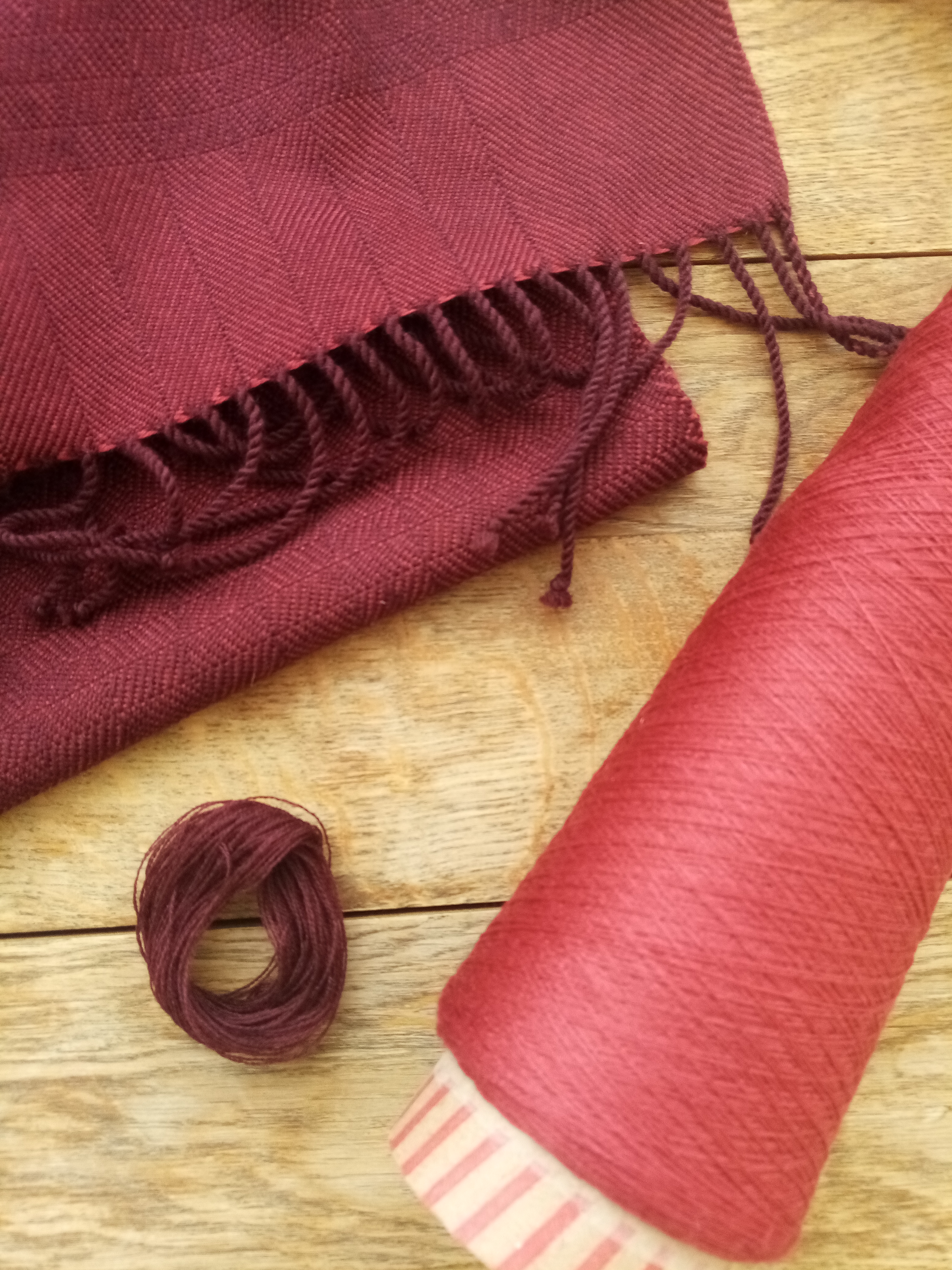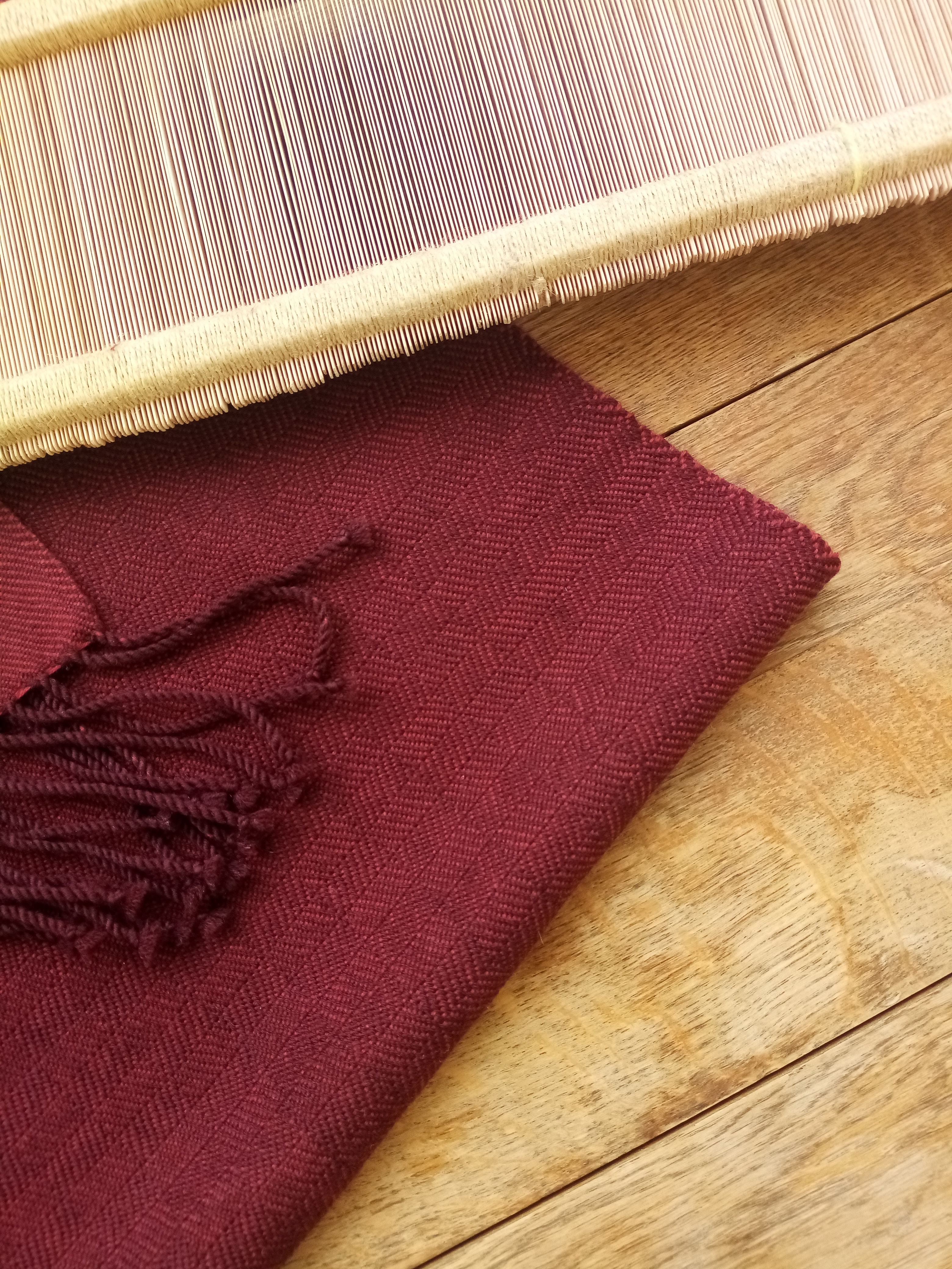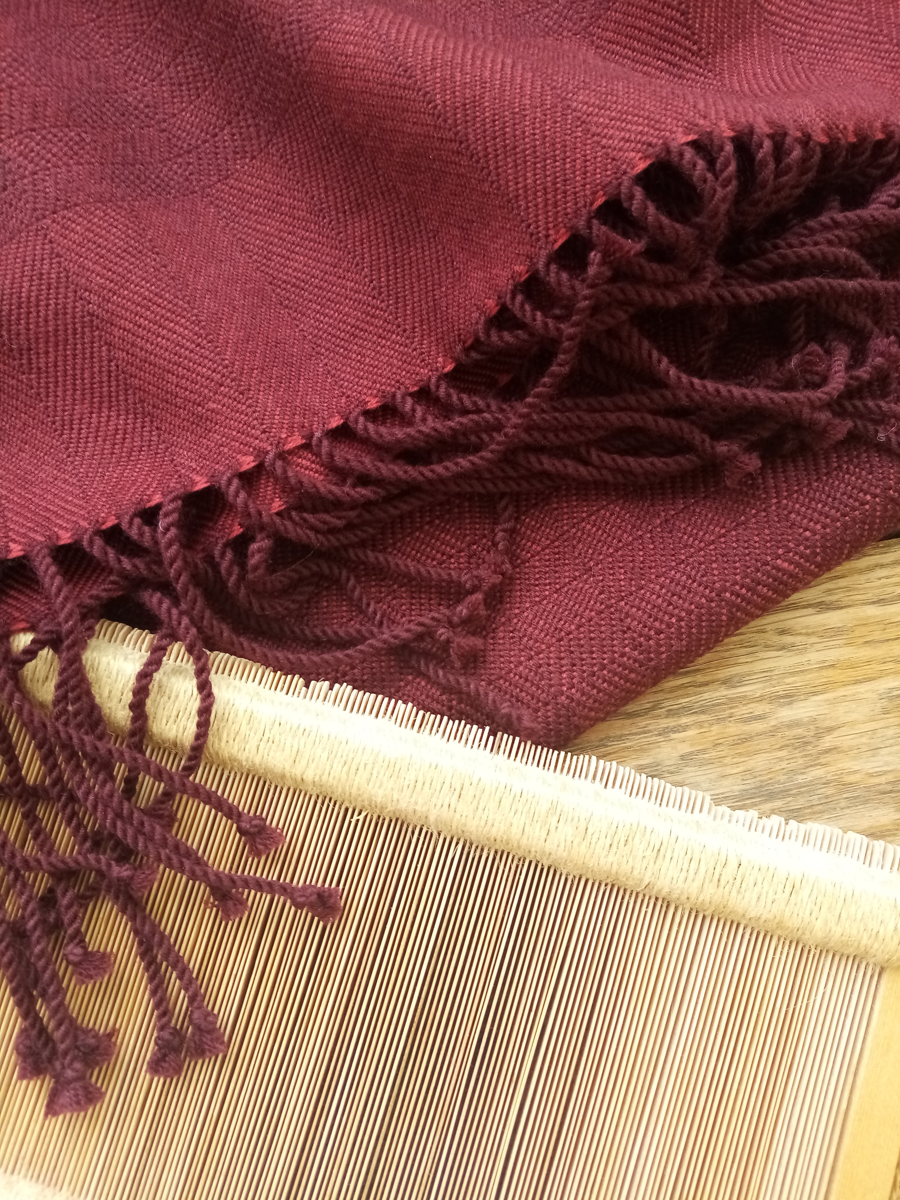Итак, я ткала широкий и длинный палантин из тонких мериносовых и кашемировых нитей бордового и приглушённо-красного цветов.