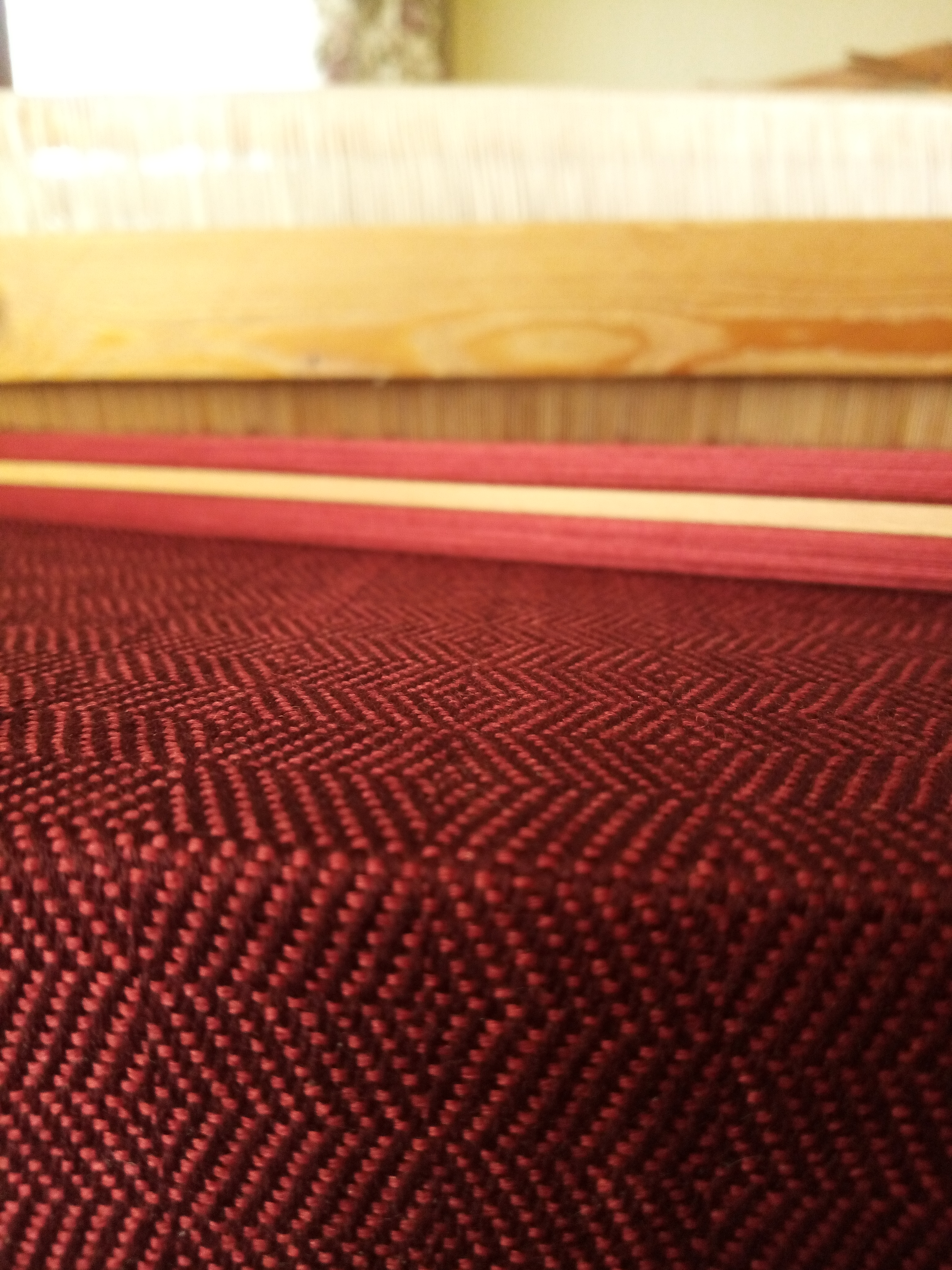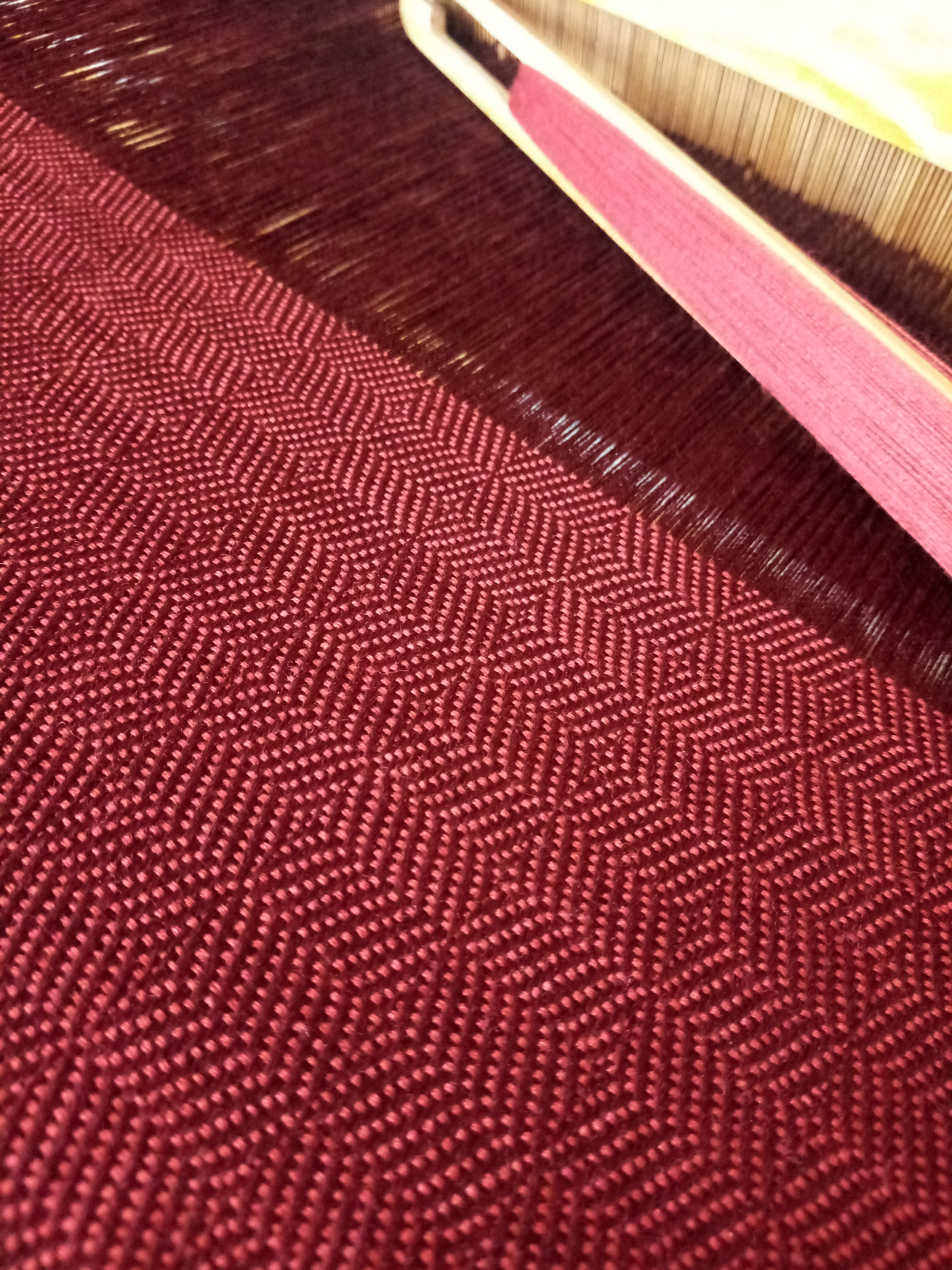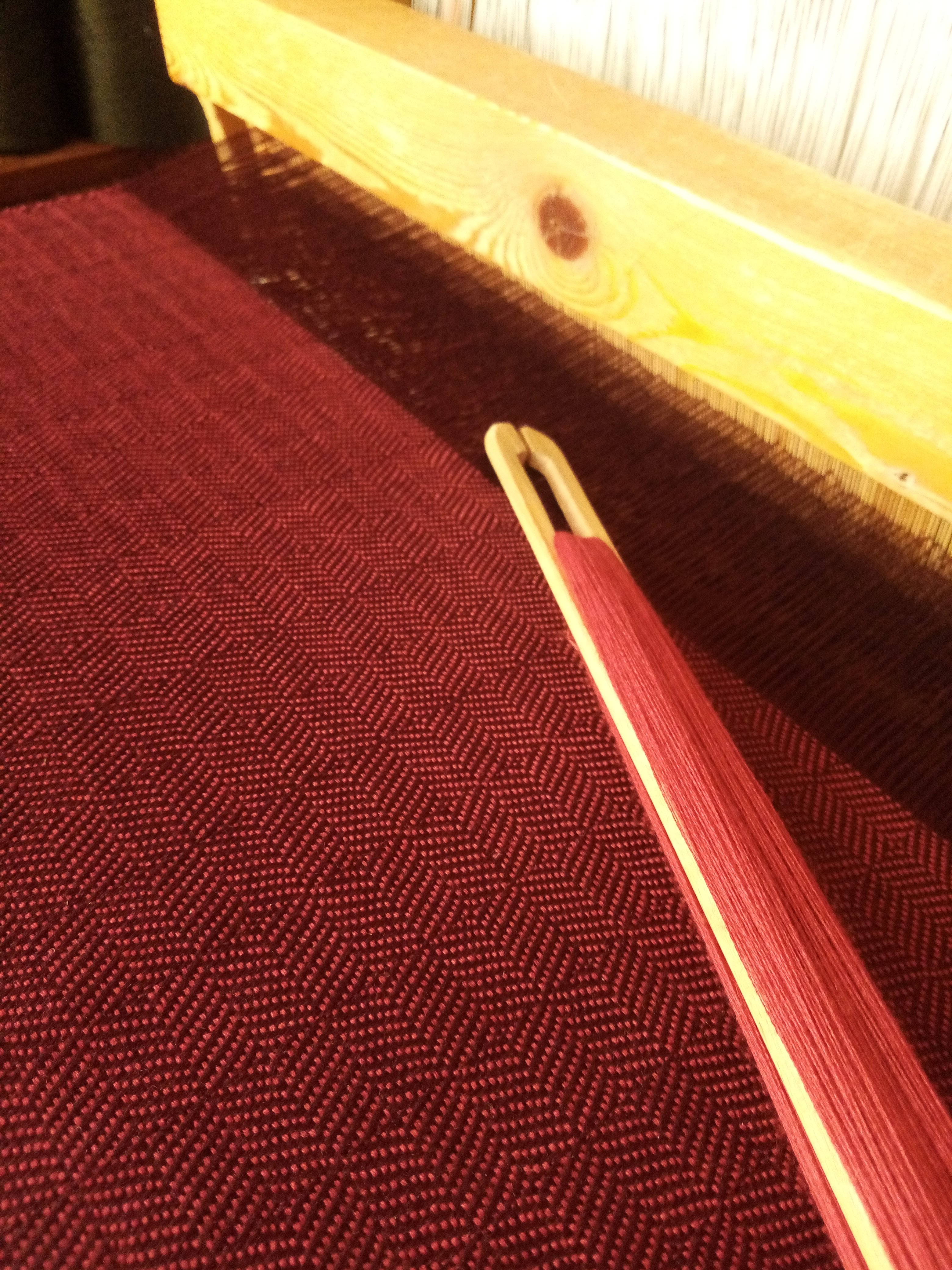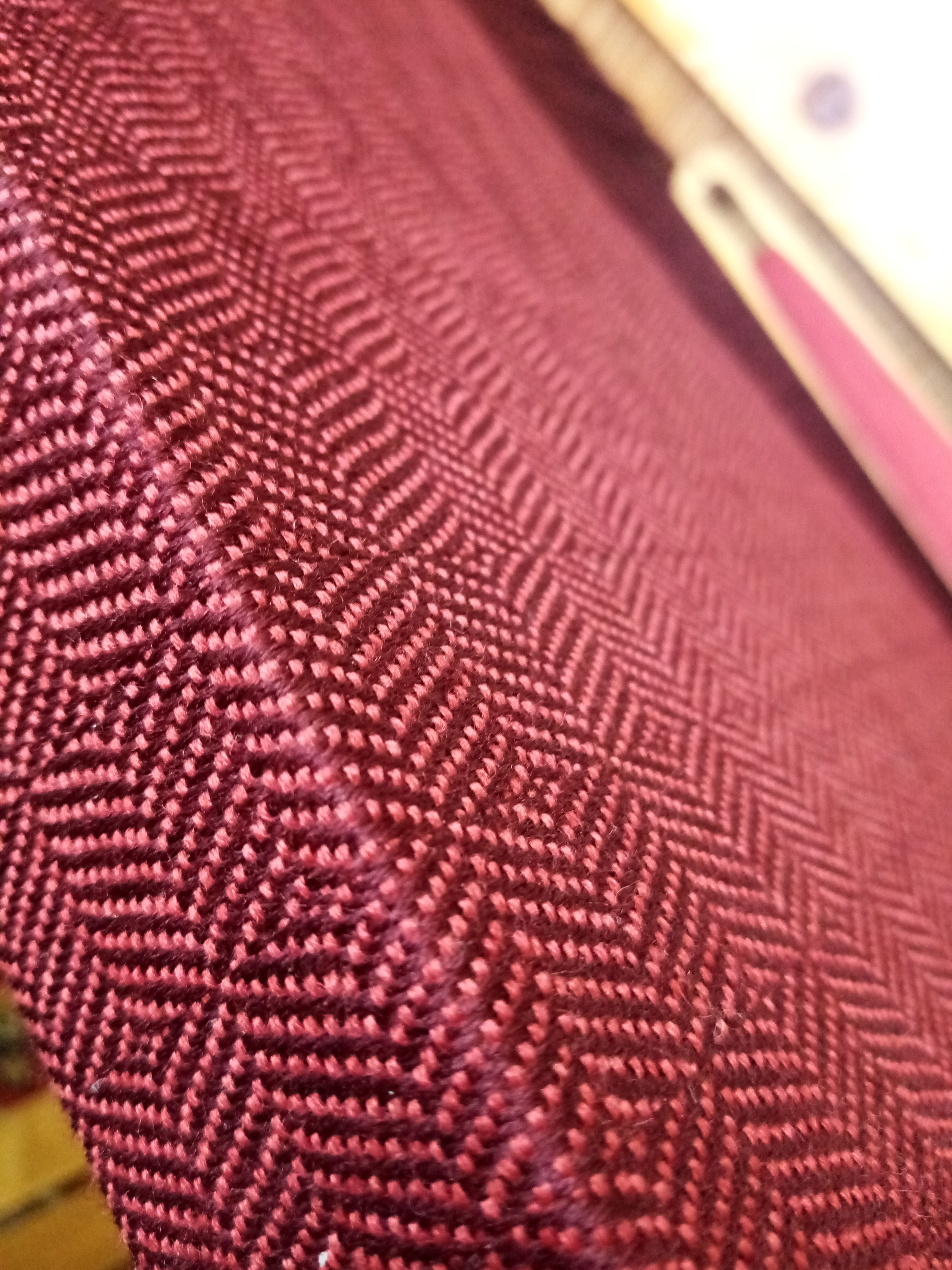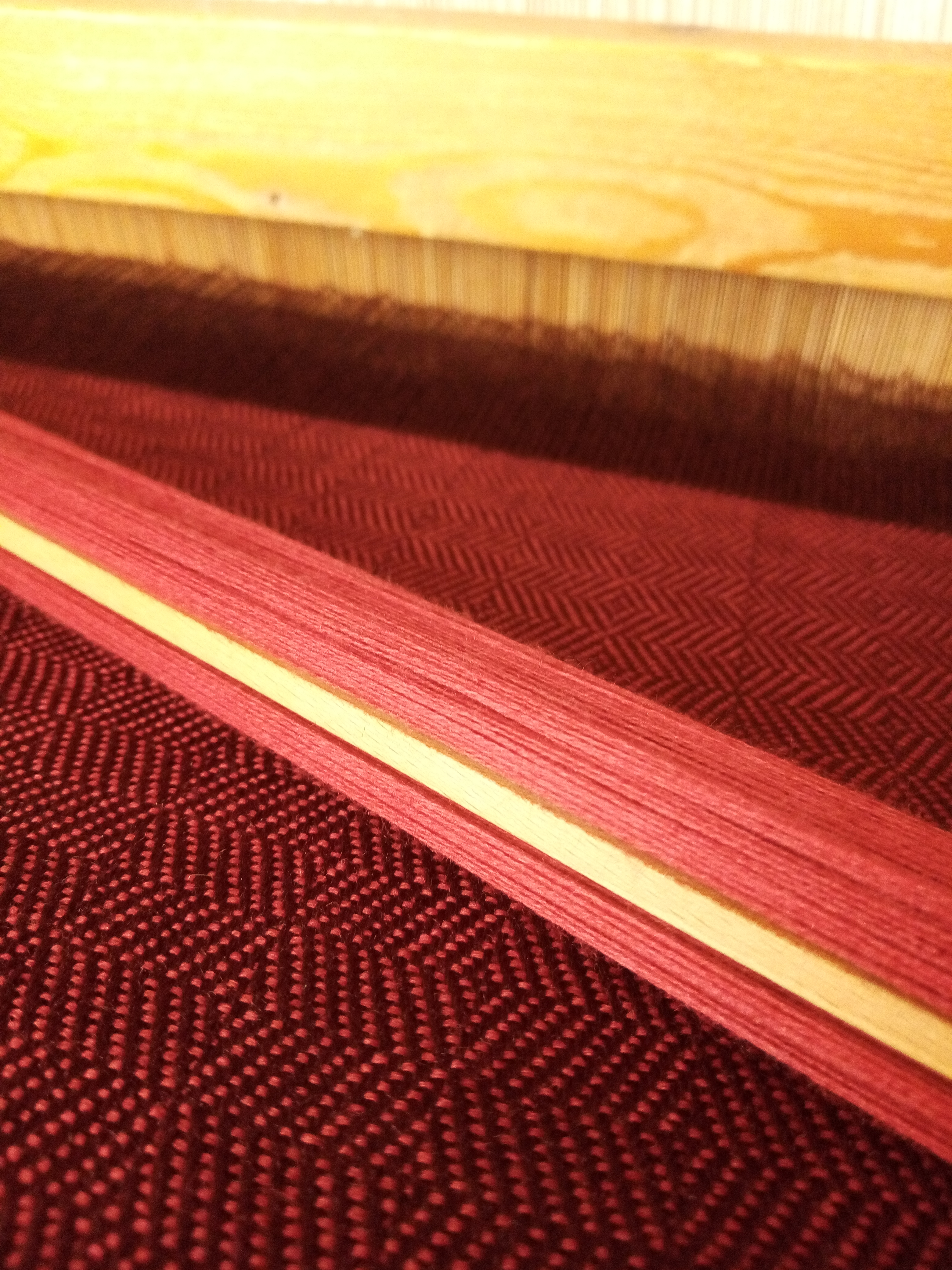 Итак, я ткала широкий и длинный палантин из тонких мериносовых и кашемировых нитей бордового и приглушённо-красного цветов.