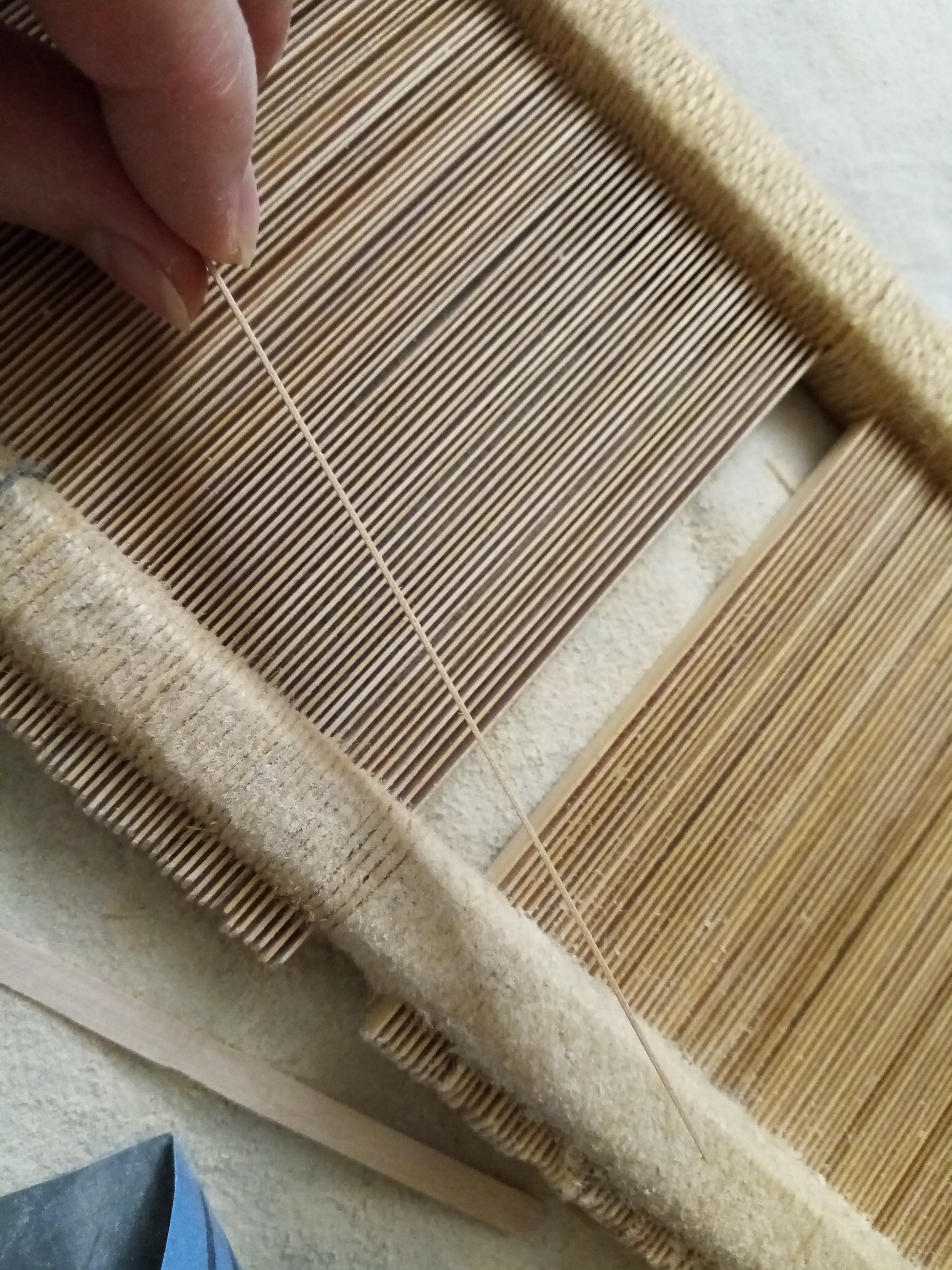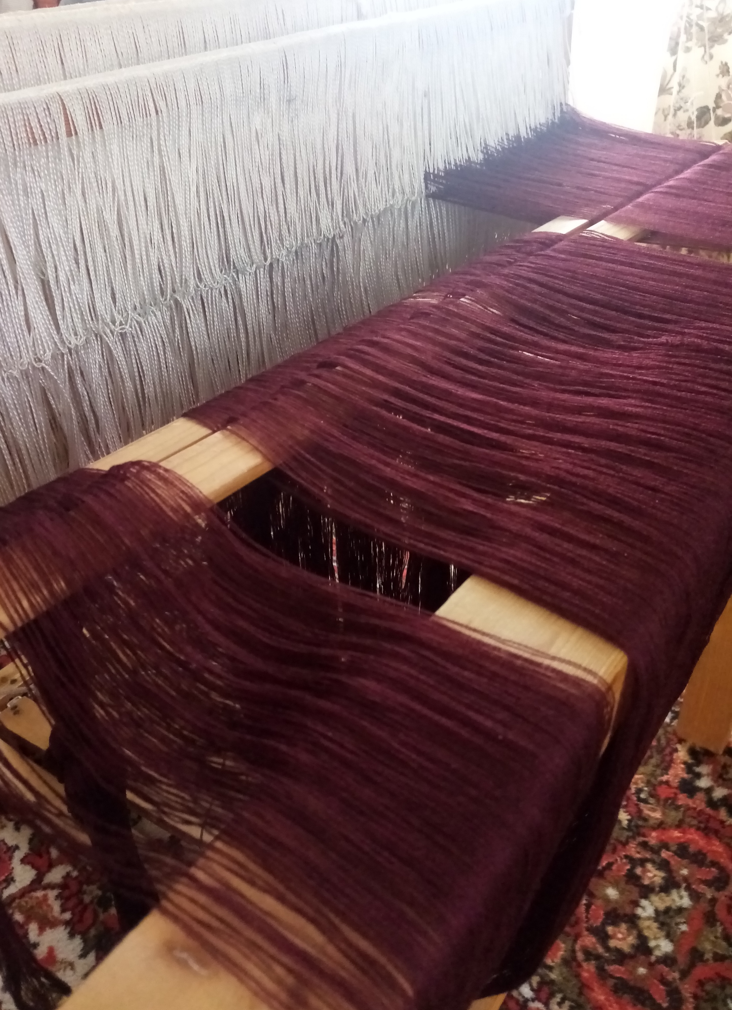 Люди не знакомые с ткачеством говорят, что ткать сложно, но нет, самое сложное — подготовить и правильно заправить нити в станок. Чтобы получилось красивое переплетение, нужно каждую ниточку вдеть в единственно верную петлю.