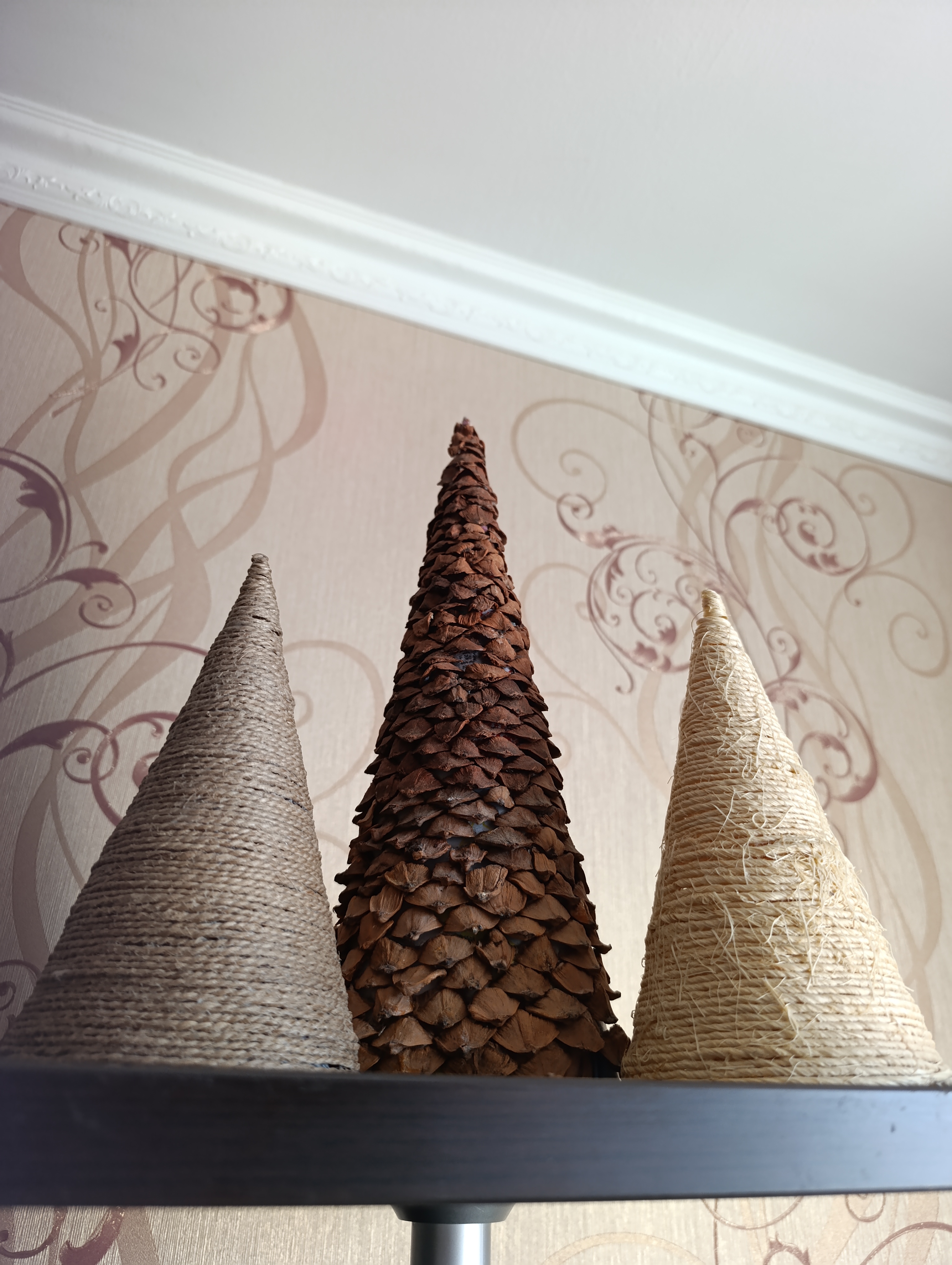Конус из джутовых нитей. Сначала сделала картонный конус и обернула его полиэтиленовым пакетом (чтобы потом легче было снимать). Опустила джутовую нить в крепкий строительный клей ПВА для картона и аккуратно, нить к нити, намотала на форму. Когда всё высохло, вынула картон и пакет — нити отлично склеились между собой, и конус держит форму. Ещё я нашла в строительном магазине моток из белых волокон и точно так же сделала второй конус.