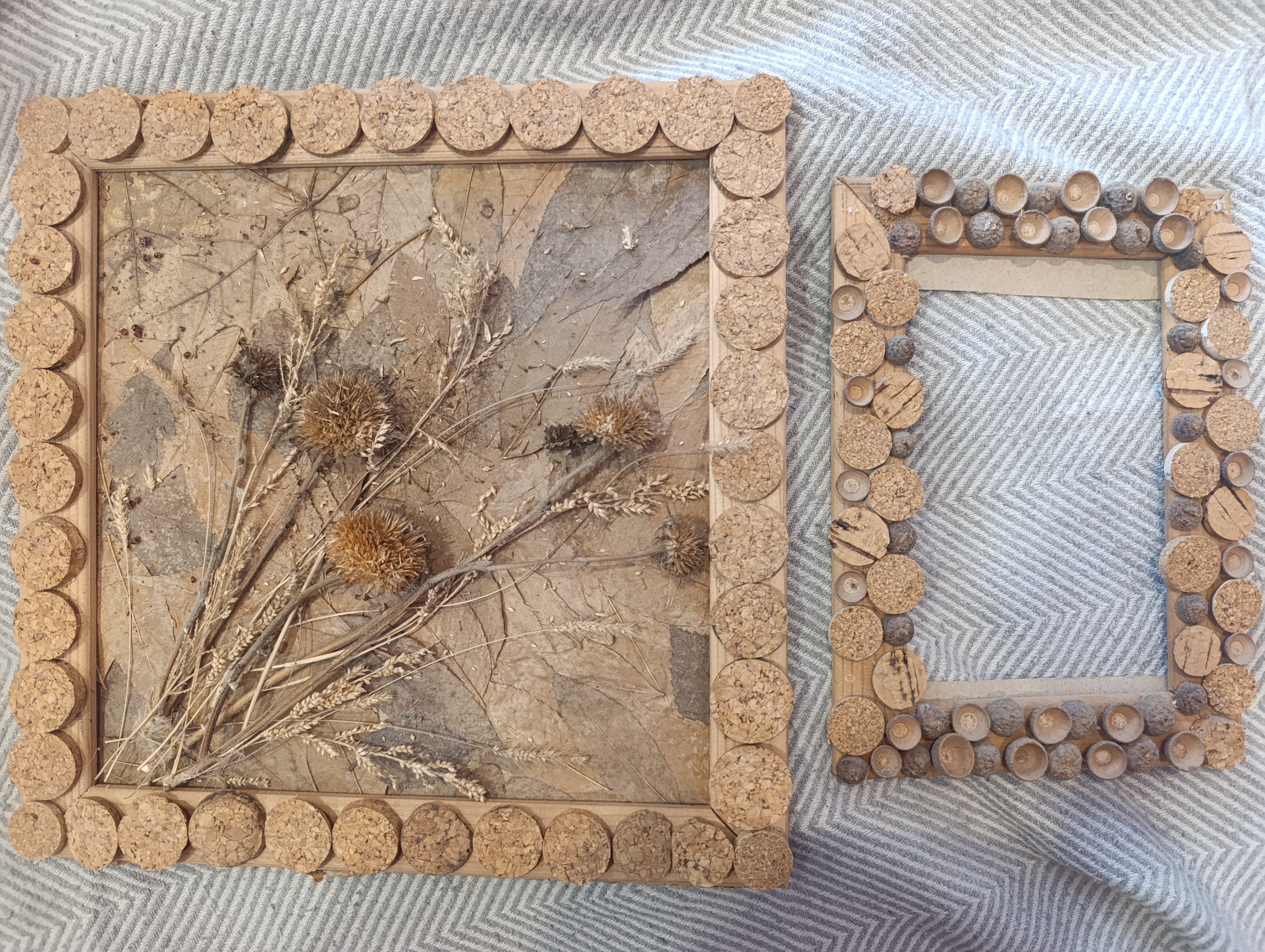 Вторая рамка — из шапочек желудей и пробки. Наклеивала их в шахматном порядке, чередуя. Смотрится объёмно и фактурно.