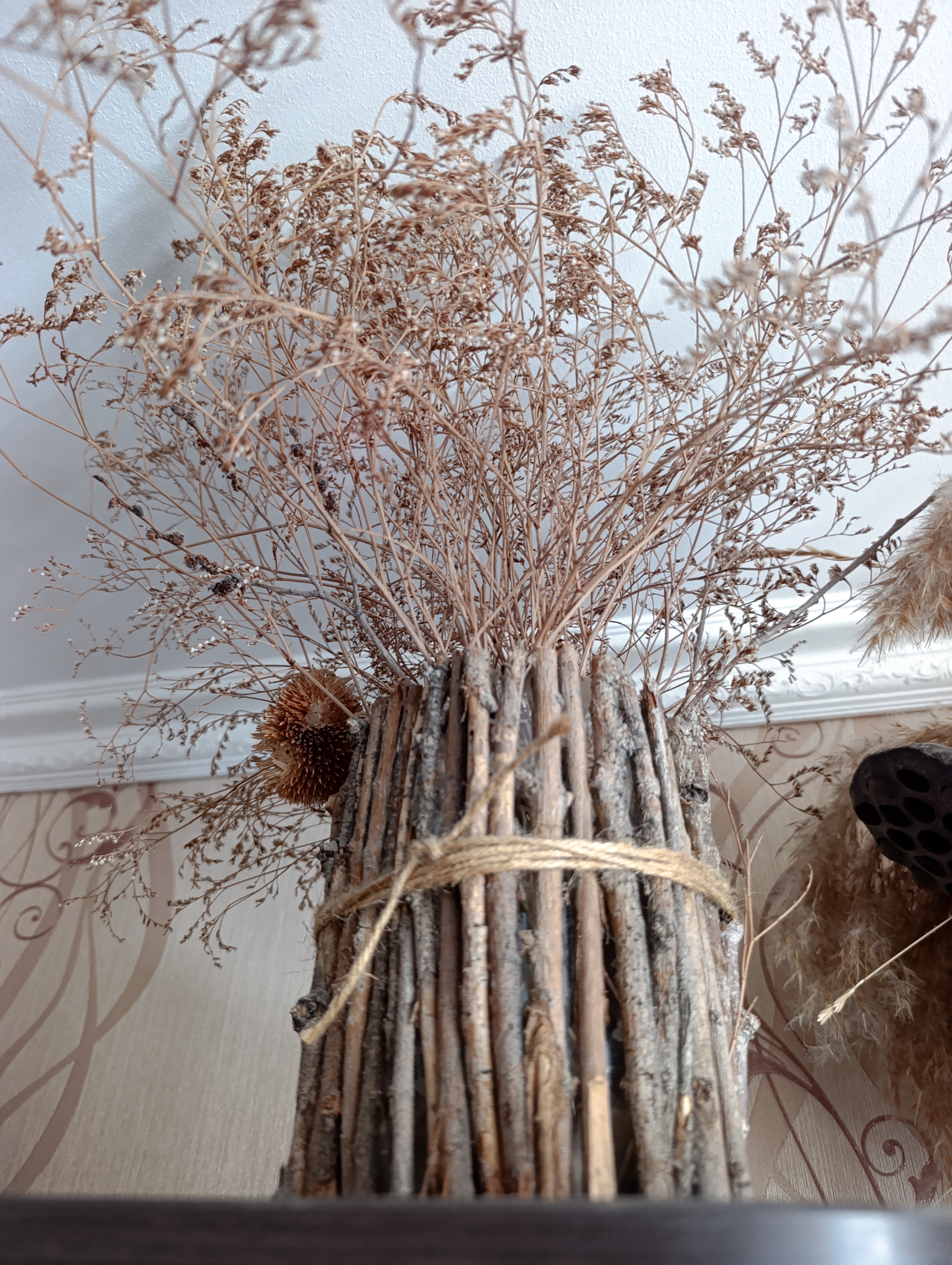 Ваза из палочек. Взяла прозрачную пластиковую бутылку, отрезала верхушку и обклеила её сухими веточками. В такую вазу отлично встали сухоцветы.