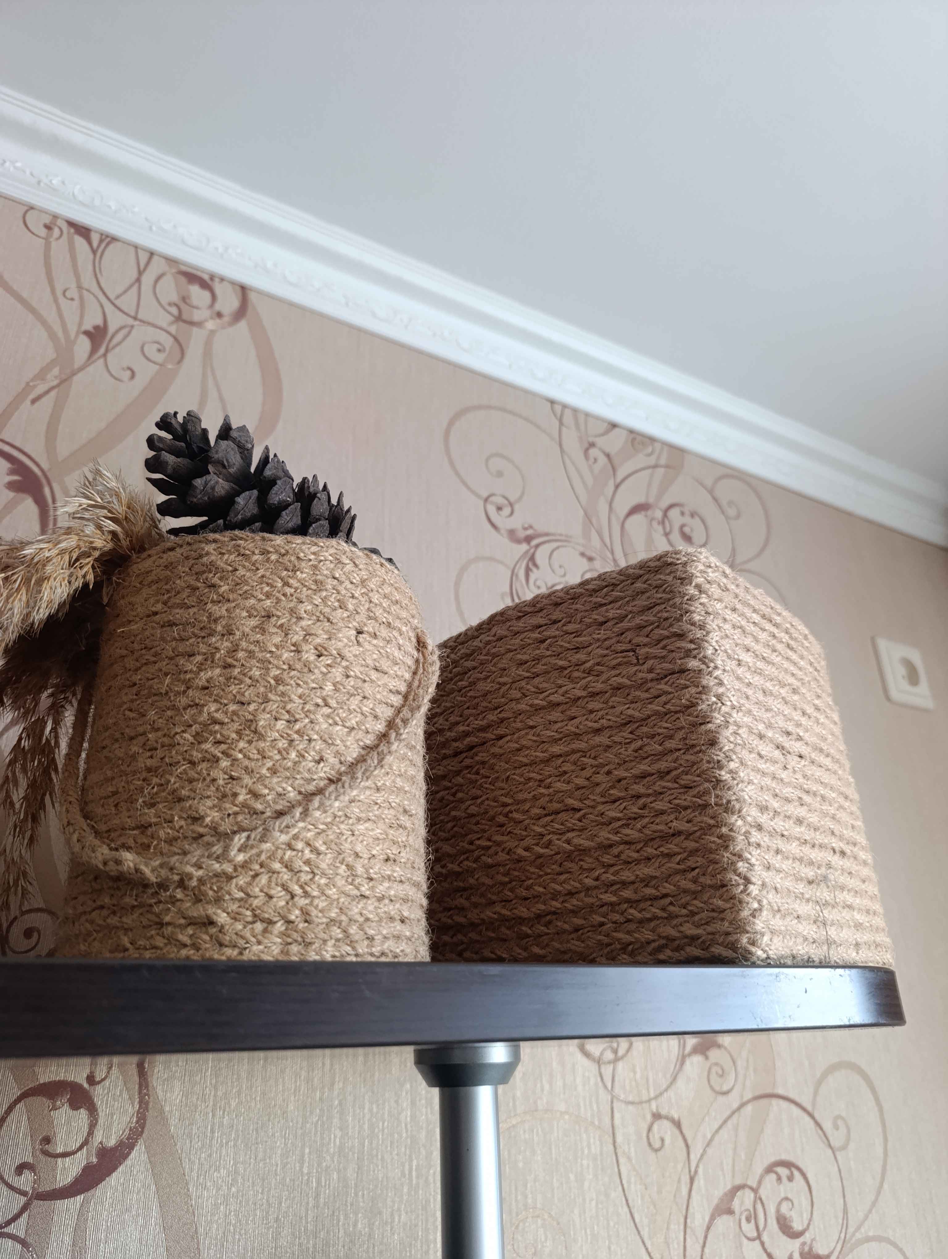 Люблю превращать ненужные коробки в уютные шкатулки. Беру любую коробку, обклеиваю внутри тканью, а снаружи — косичками из джутовой нити. Косички плету сама: отматываю длинную двойную нить и заплетаю. Приклеиваю на «Момент» (но у него запах едкий, лучше клеевым пистолетом — безопаснее). Процесс небыстрый, зато результат очень тёплый, домашний. Такая коробка в любой интерьер впишется и в подарок годится.