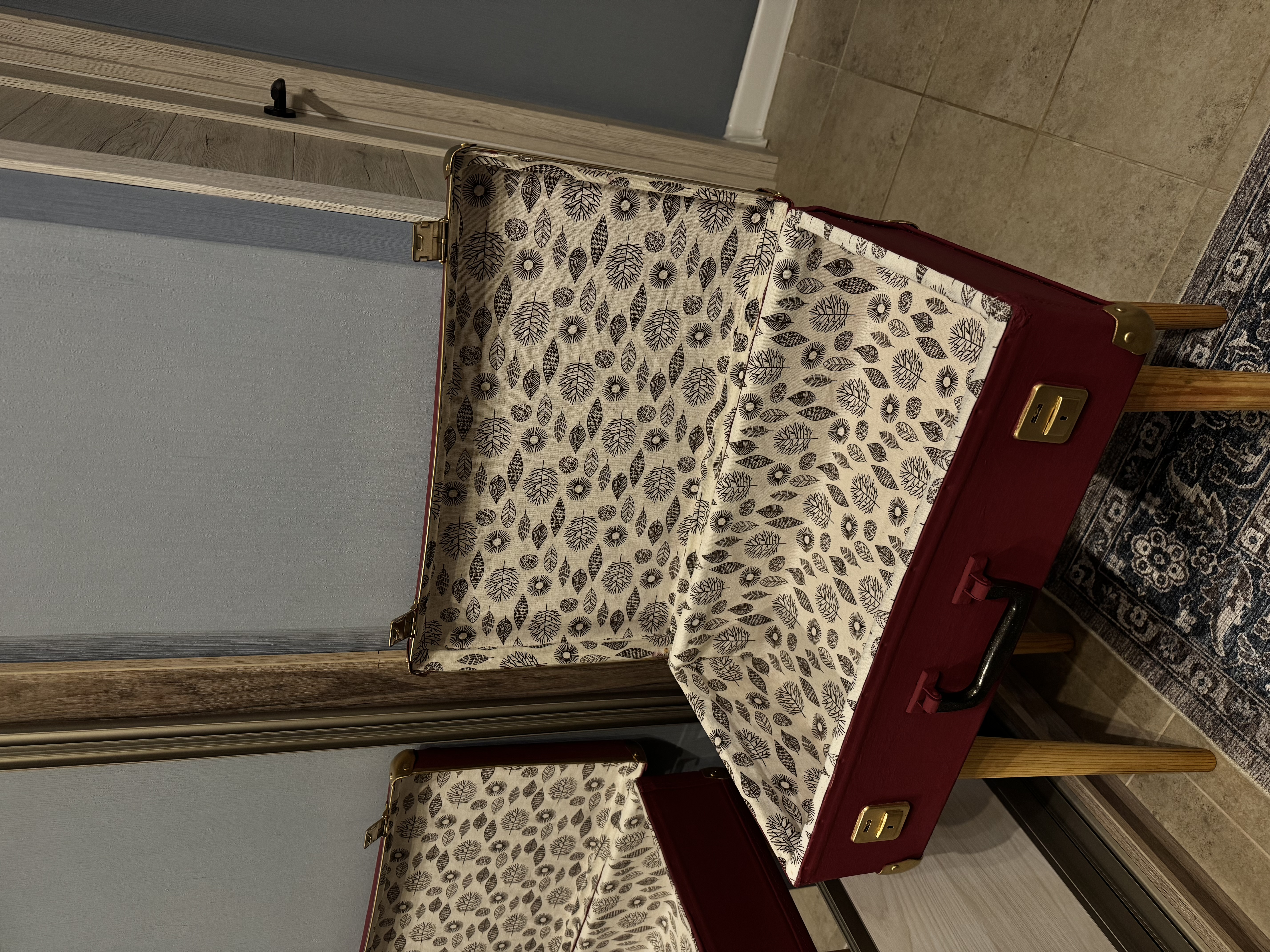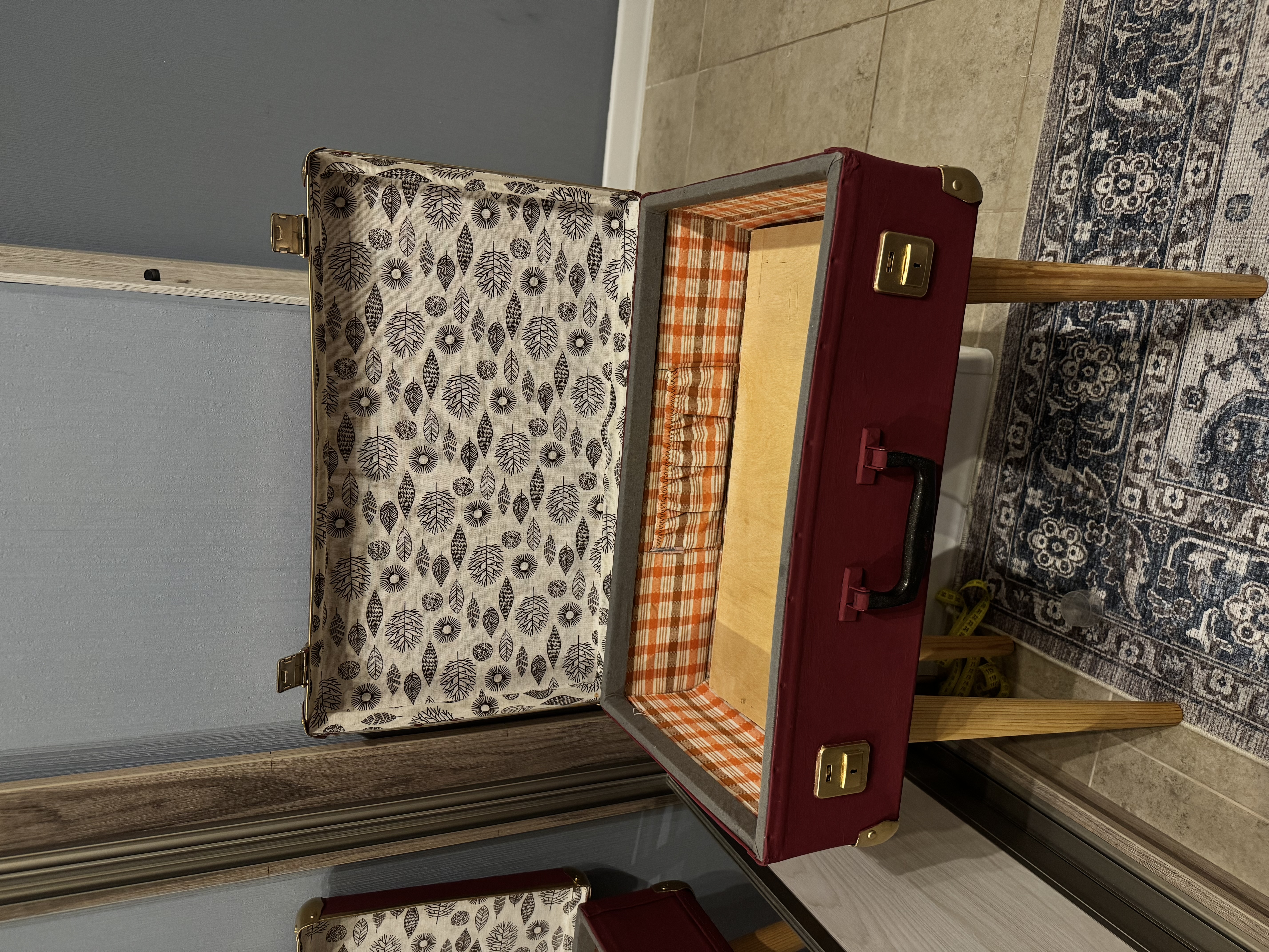 Естественно, пришлось внутри чемодана все обклеить заново тканью, чтобы скрыть фанеру. Ткань у меня была дома, шила ранее из нее шторочки.