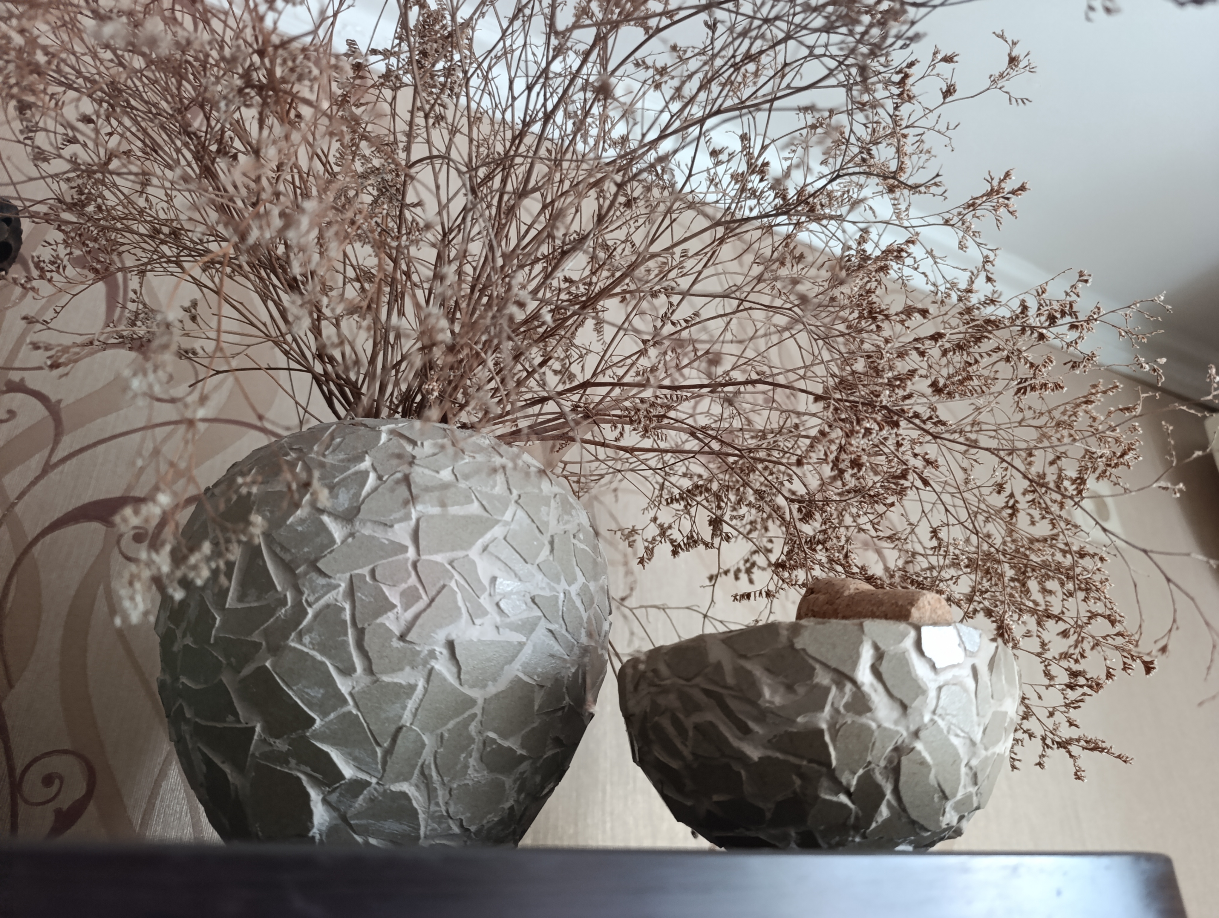 Вдохновившись, сделала так же цветочные горшки и миску. А моя последняя работа, сделанная вчера, — вытянутая ваза. Швы на ней ещё не затерты, но она почти готова.