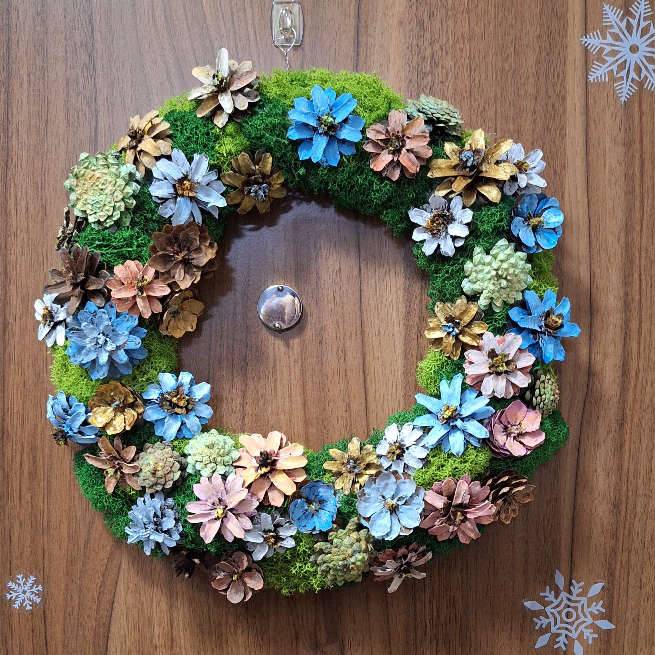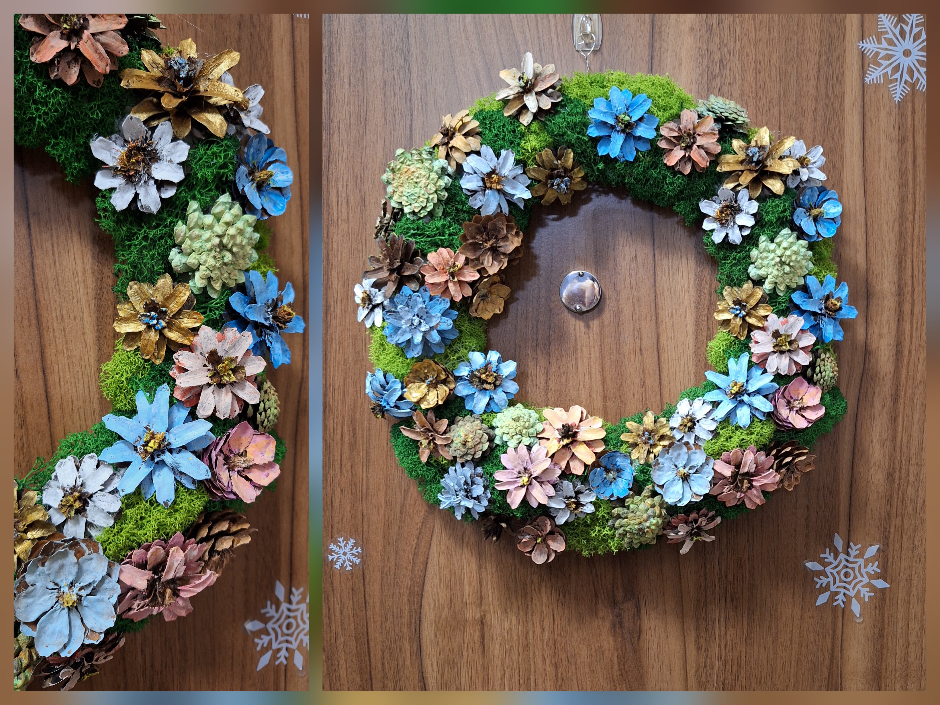 Основу я ничем не красила, так и оставила, но если вы хотите сделать венок полностью из шишек, то мой совет, покрасить основу в темный цвет, все же шишки оставляют просветы между собой, в которые проглядывает светлый цвет газет. Я использовала еще и мох, так что он помог прикрыть газету, где это требовалось.