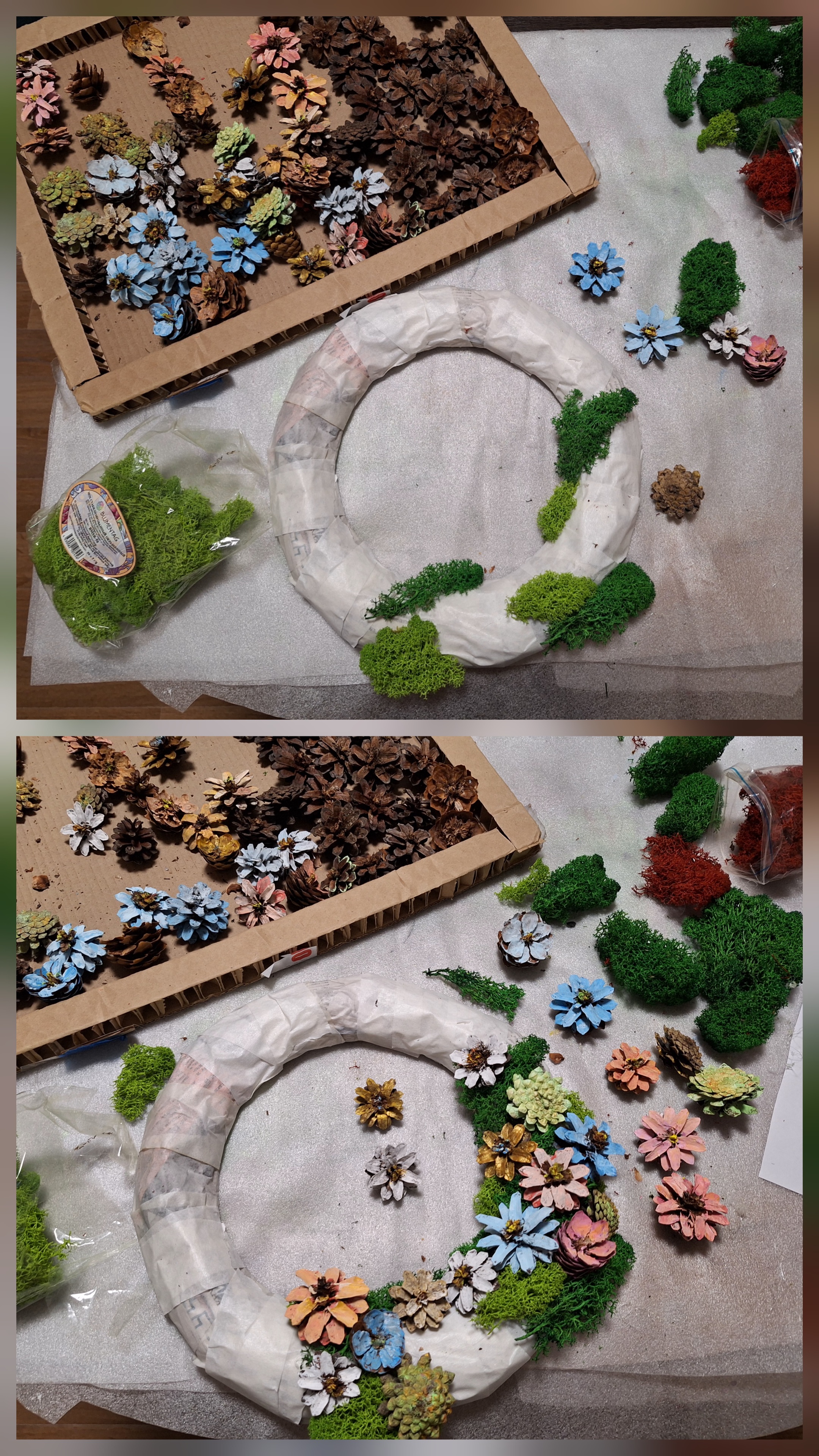 - творим, приклеиваем шишки и мох в нужном нам порядке. Я предварительно выстраивала композицию, после чего уже клеила