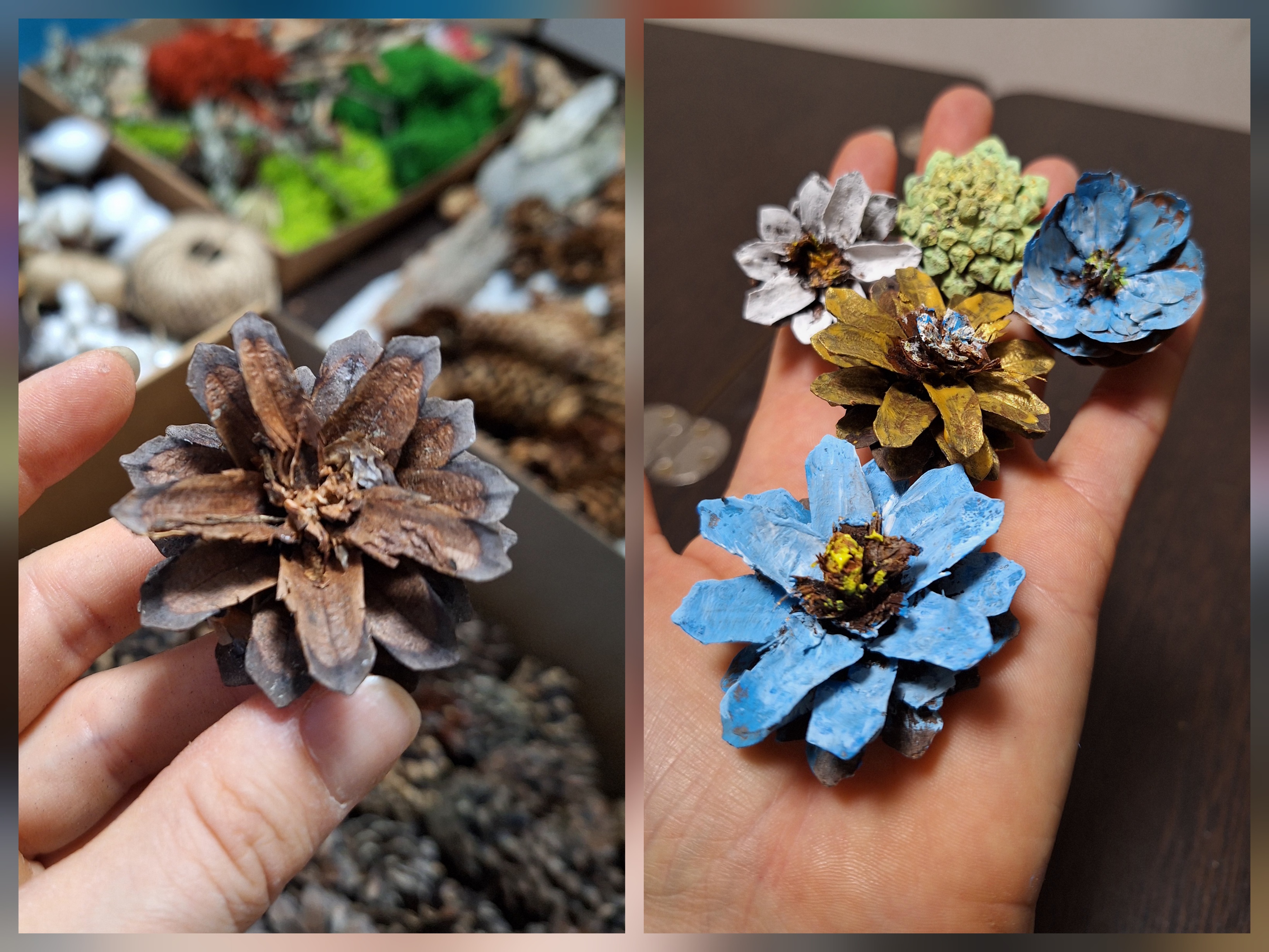 - красим шишки. Цвет по вашему желанию, можно выдержать в пастельной гамме, можно вообще взять всего два цвета сближенных или, наоборот, контрастных, либо сделать разные оттенки одного цвета, тут дело вкуса и вашей фантазии. Но надо учитывать, чем больше цветов вы используете, тем более дробная получится композиция, мой совет не использовать больше 4-5, можно оставить естественный цвет, если он вам подходит. Шишки можно использовать и обратной стороной, так сказать, покрасить их “попки”, тоже получается интересно.
