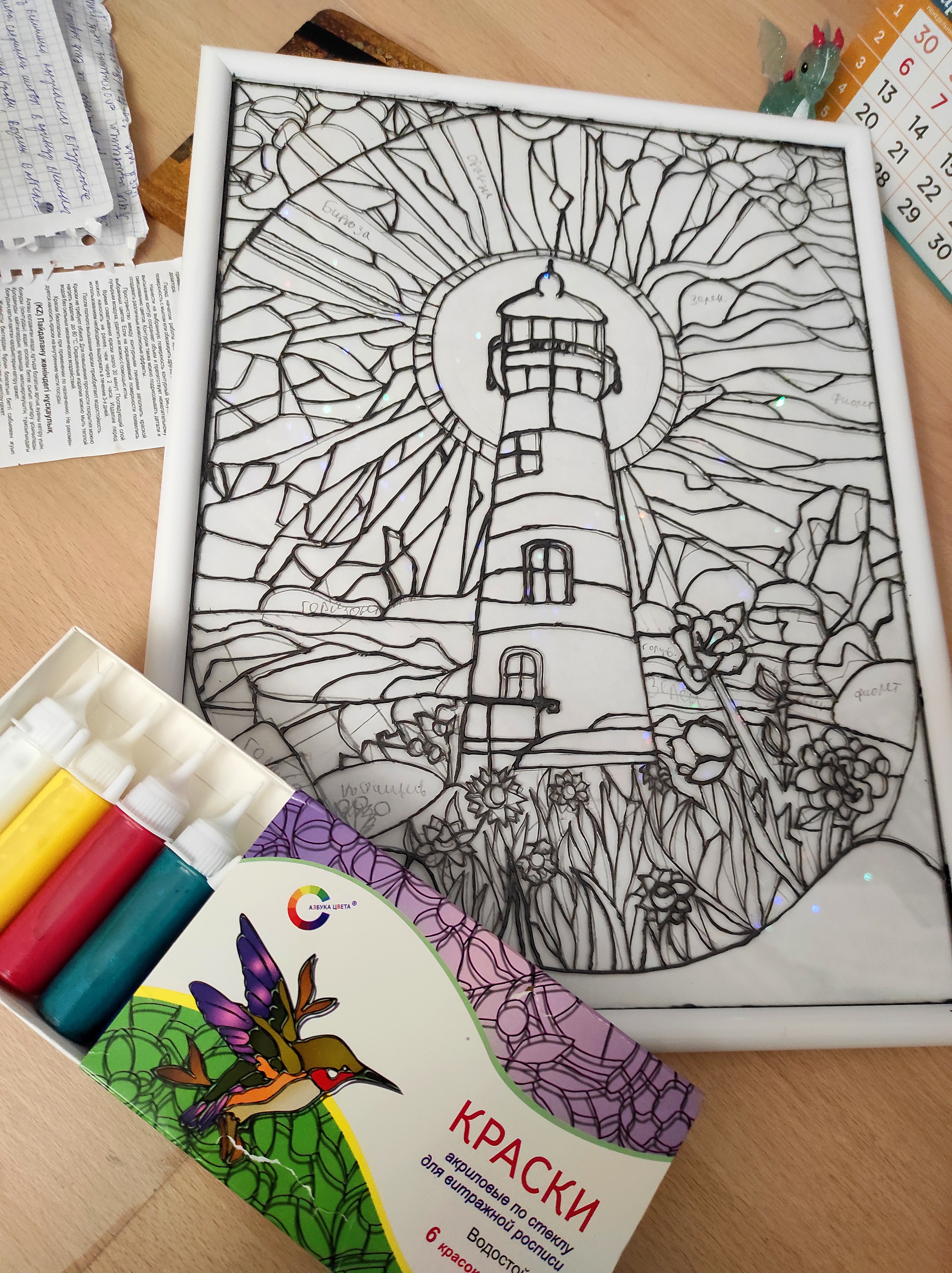 Я купила акриловые витражные краски: 6 основных цветов (в наборе так же был контур), стекло — взяла из обычной фоторамки, ацетон для обезжиривания поверхности и палитру для смешивания оттенков.