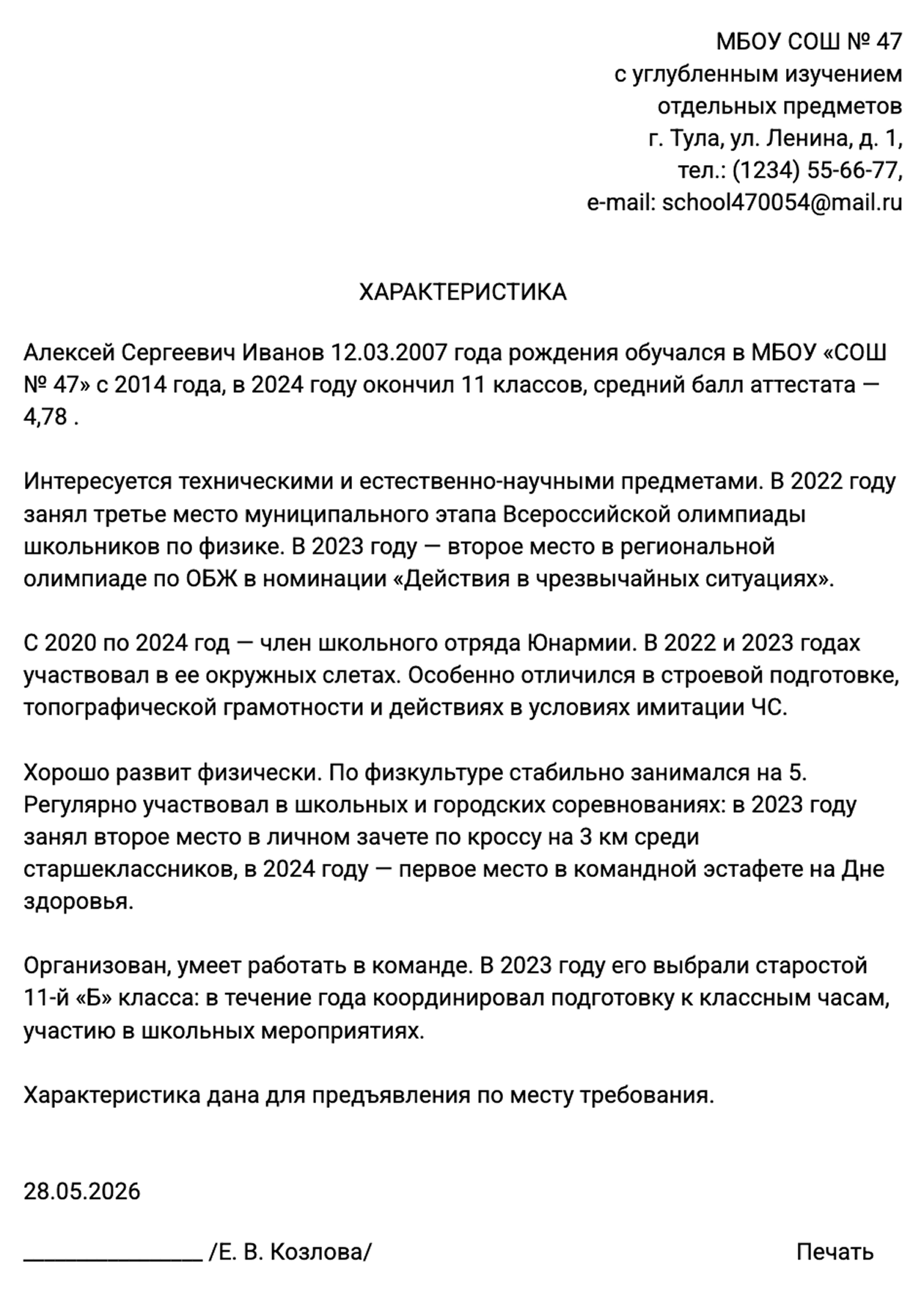 | Почему плохо | Слова могут расходиться с реальностью: человек, который пишет характеристику, часто не сверяет ее с аттестатом — например, там одни тройки, а успеваемость — якобы хорошая |