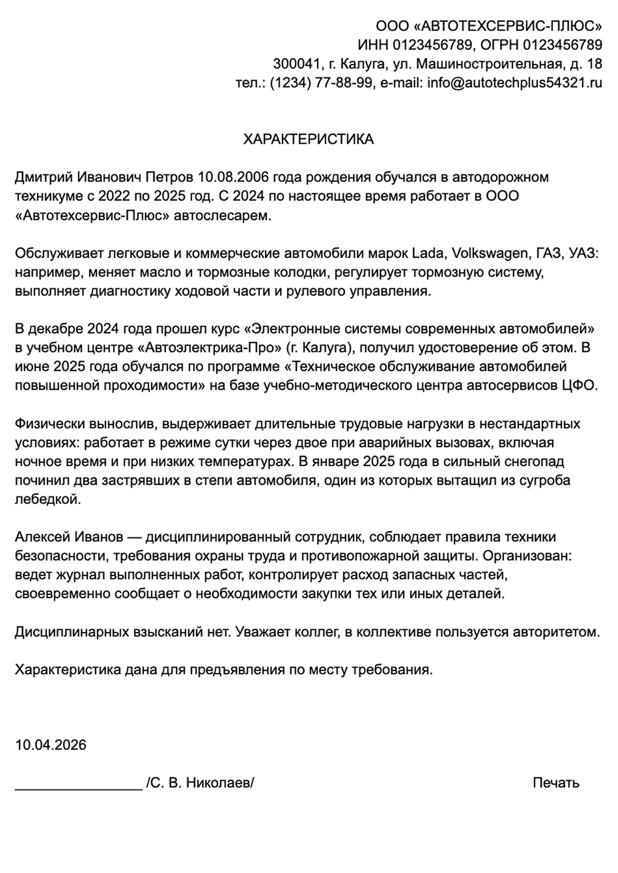 В заключении обычно указывают, для какой организации и с какой целью выдана характеристика. Или обходятся фразой «для предъявления по месту требования». Руководитель или ответственный работник ставит дату и подпись.