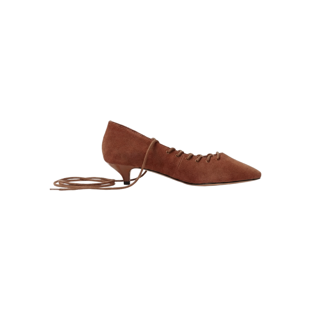Эти туфли из искусственной замши бывают коричневыми и нежно-розовыми. Привлекают они сразу несколькими трендовыми деталями: тут и викторианская шнуровка, и изящный каблук-рюмочка, и довольно закрытый подъем. Модель идеально дополнит богемные образы с летящими платьями, брюками клеш и ажурными топами