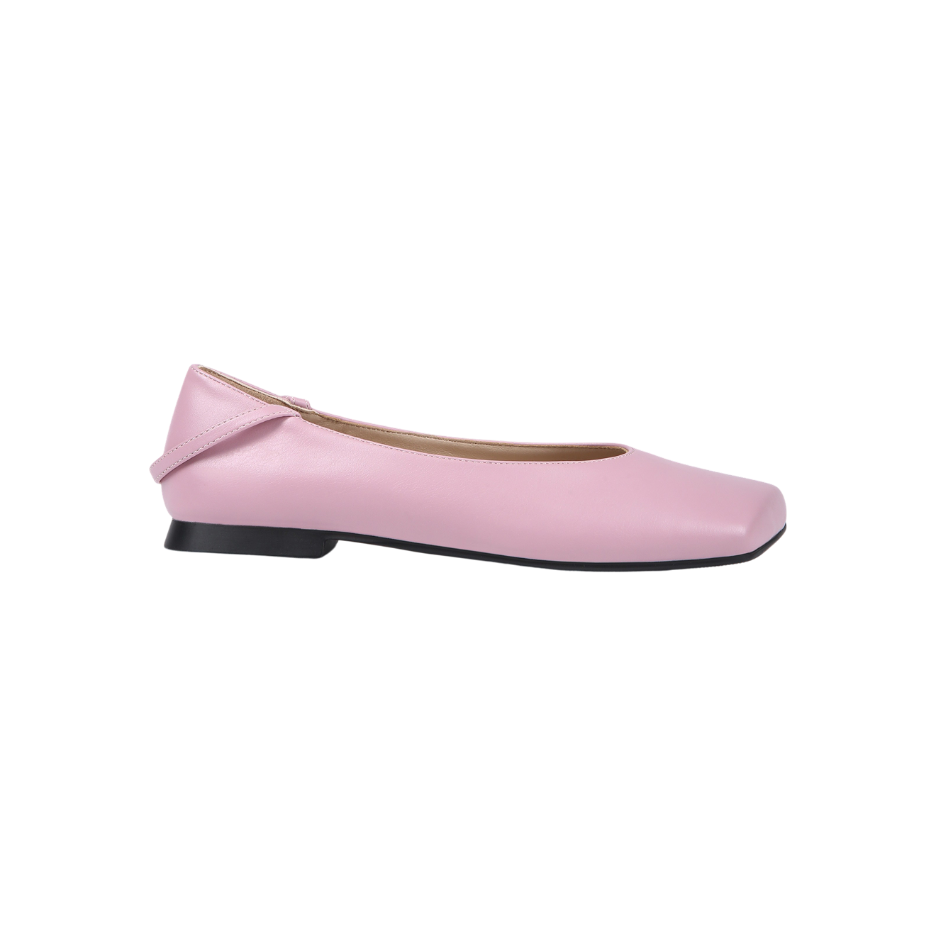 Балетки оттенка малинового маршмеллоу — отличный способ добавить яркий акцент в повседневные образы. Но их главная особенность — в мысе в форме скошенного квадрата, который превращает эту пару обуви в объект модного искусства