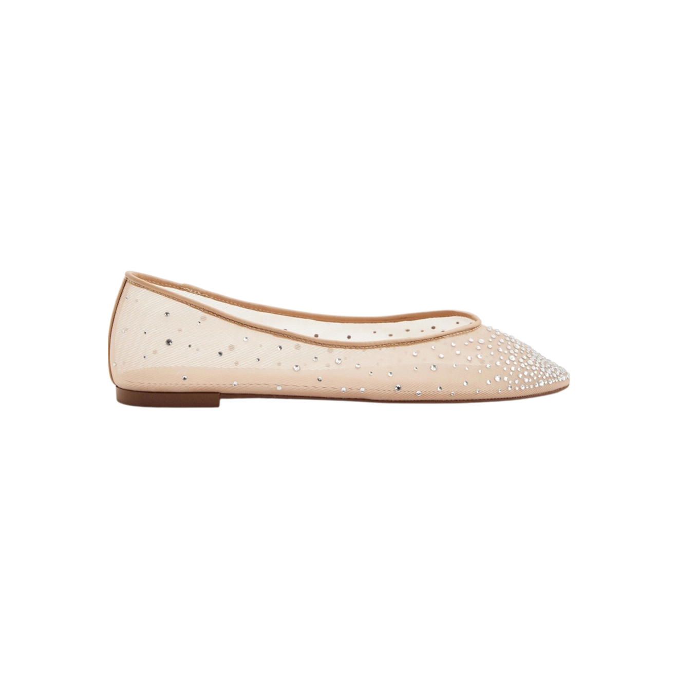 Аккуратные, невесомые, сверкающие — настоящие балетки Золушки. Пара выполнена из тонкой светло-бежевой сетки и украшена мириадами стразов, которые будут красиво сиять на солнце. Балетки можно взять с собой в отпуск или носить в городе практически с чем угодно, будь то романтичное платье или строгие брюки с элегантной блузой