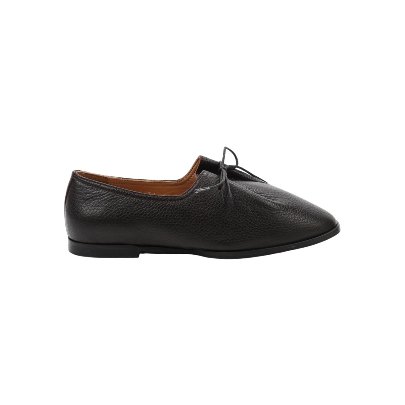 Туфли-джазовки локальной марки Guguza — нетривиальная альтернатива кедам и кроссовкам. Модель выполнена из натуральной кожи темно-коричневого цвета, близкого к чистому черному. За счет лаконичного силуэта и минималистичного дизайна пара легко впишется в любой стиль: от строгой классики до бохо-шика