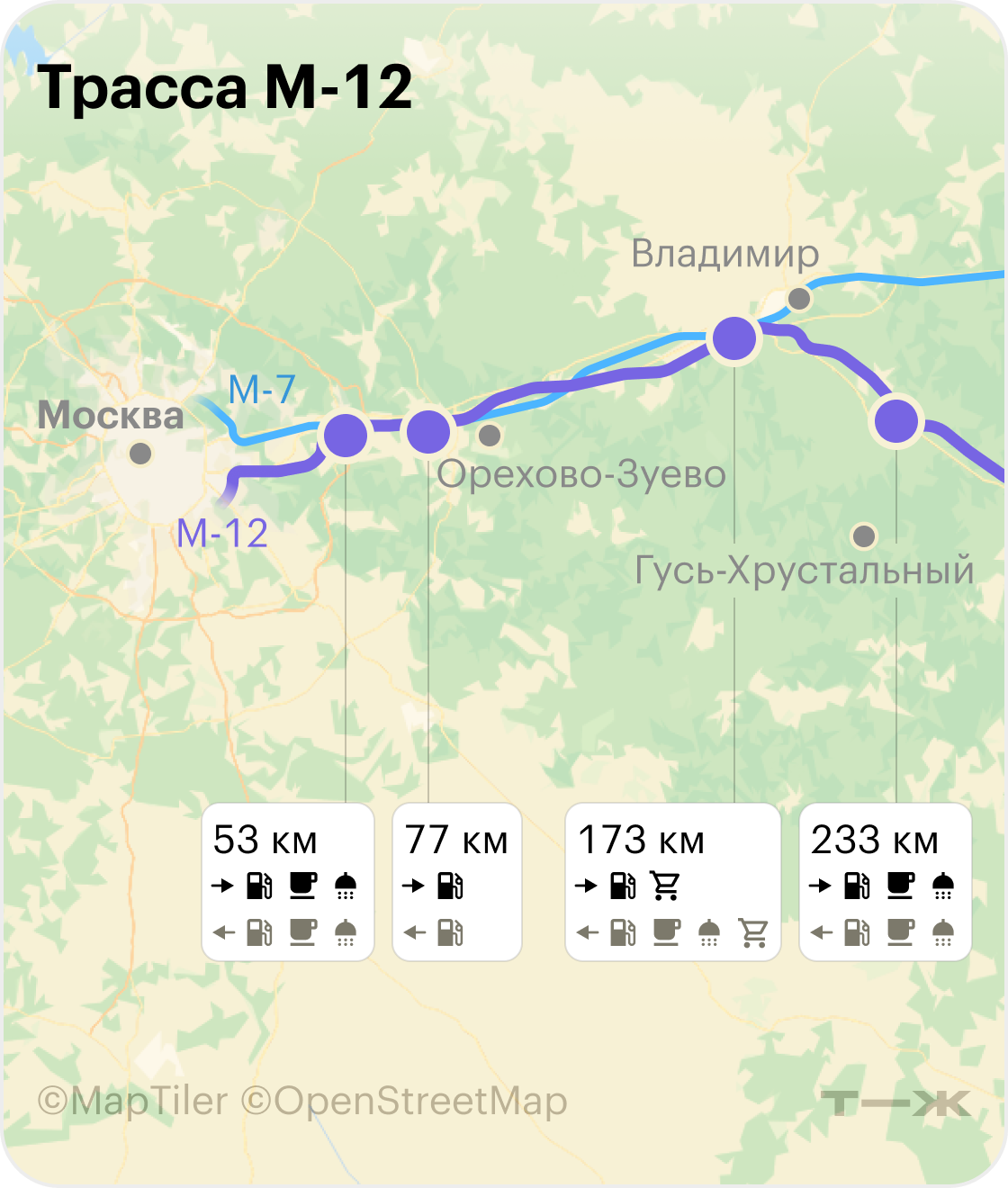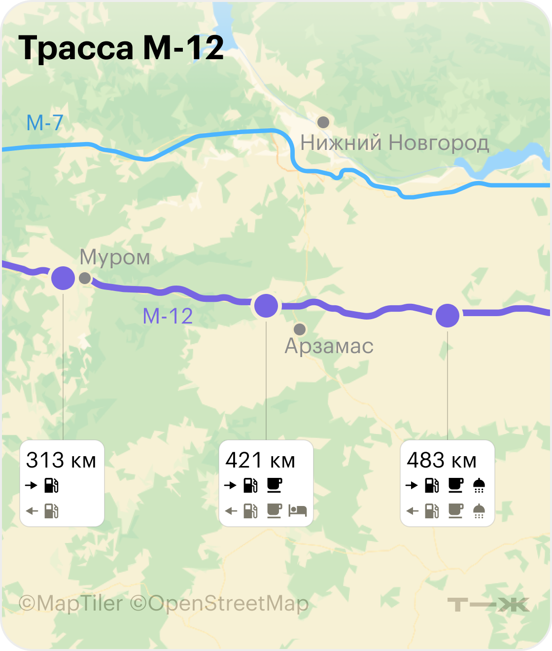 Трасса М-12 проходит через восемь регионов — Московскую, Владимирскую, Нижегородскую области, Чувашию, Татарстан, Башкирию, Пермский край и Свердловскую область — вдали от населенных пунктов. Но на М-12 много развязок, по которым можно съехать на прилегающие трассы или на бесплатную М-7, чтобы попасть во Владимир, Муром, Арзамас, Нижний Новгород, Чебоксары, Казань, Набережные Челны, Ижевск, Пермь, Уфу и Екатеринбург.