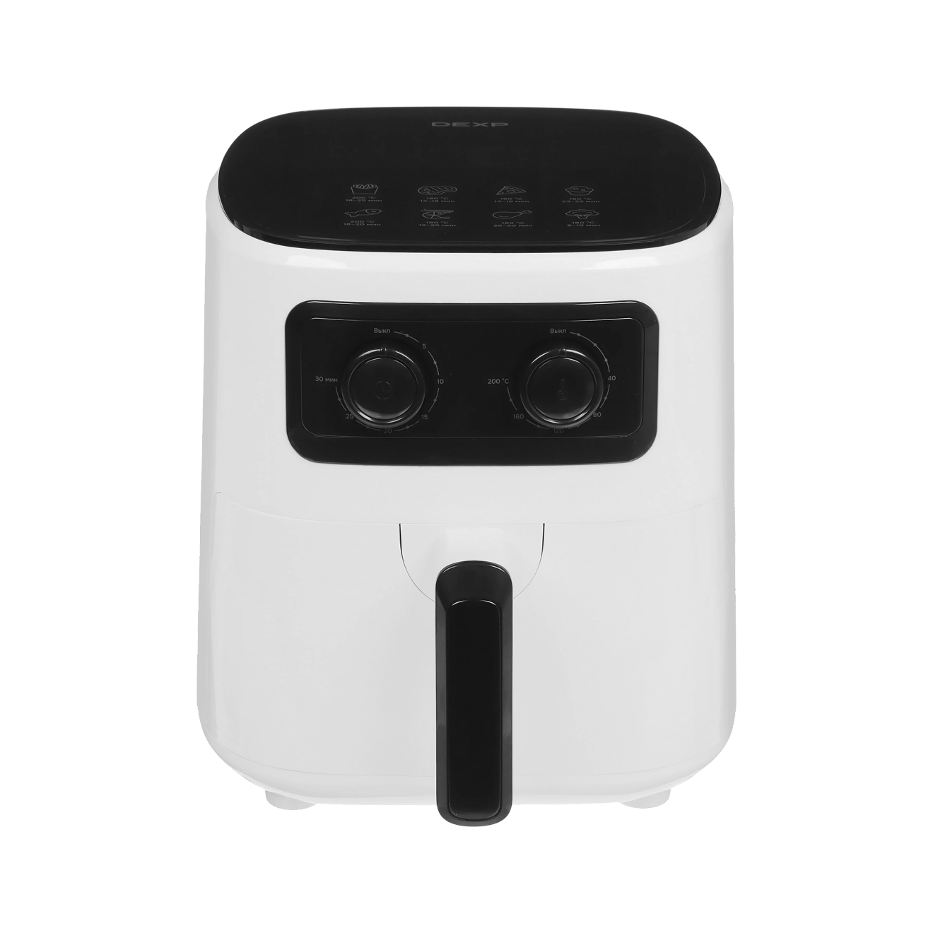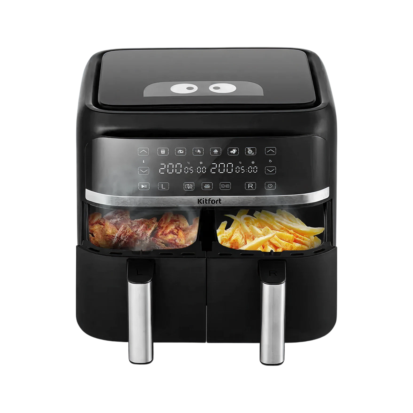 Мощный обдув горячим воздухом в компактной камере дает нужную прожарку мяса за 10—20 минут, а на приготовление фри уходит 15—20 минут.