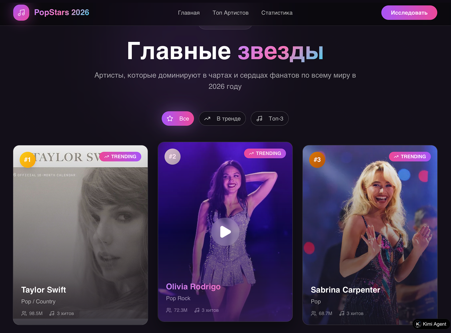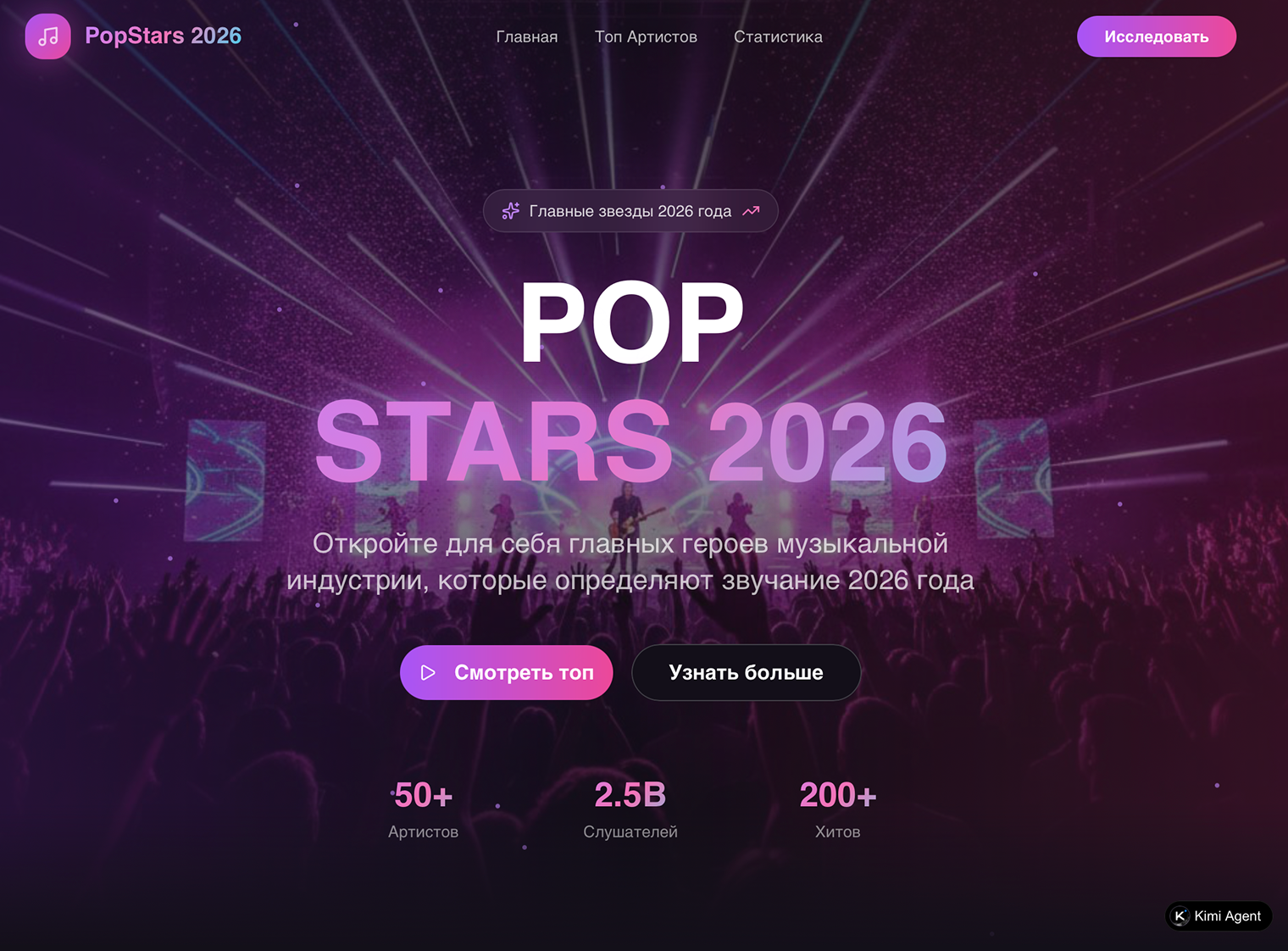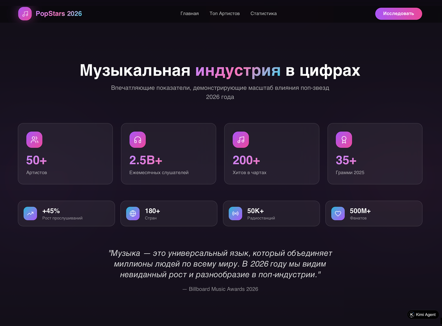 Я запросил создать сайт про главных поп-звезд 2026 года. Агент завершил задачу за 20 минут и отправил мне ссылку на готовую работу. Он собрал кликабельный сайт с розовым дизайном, но наполнение оставляет желать лучшего.