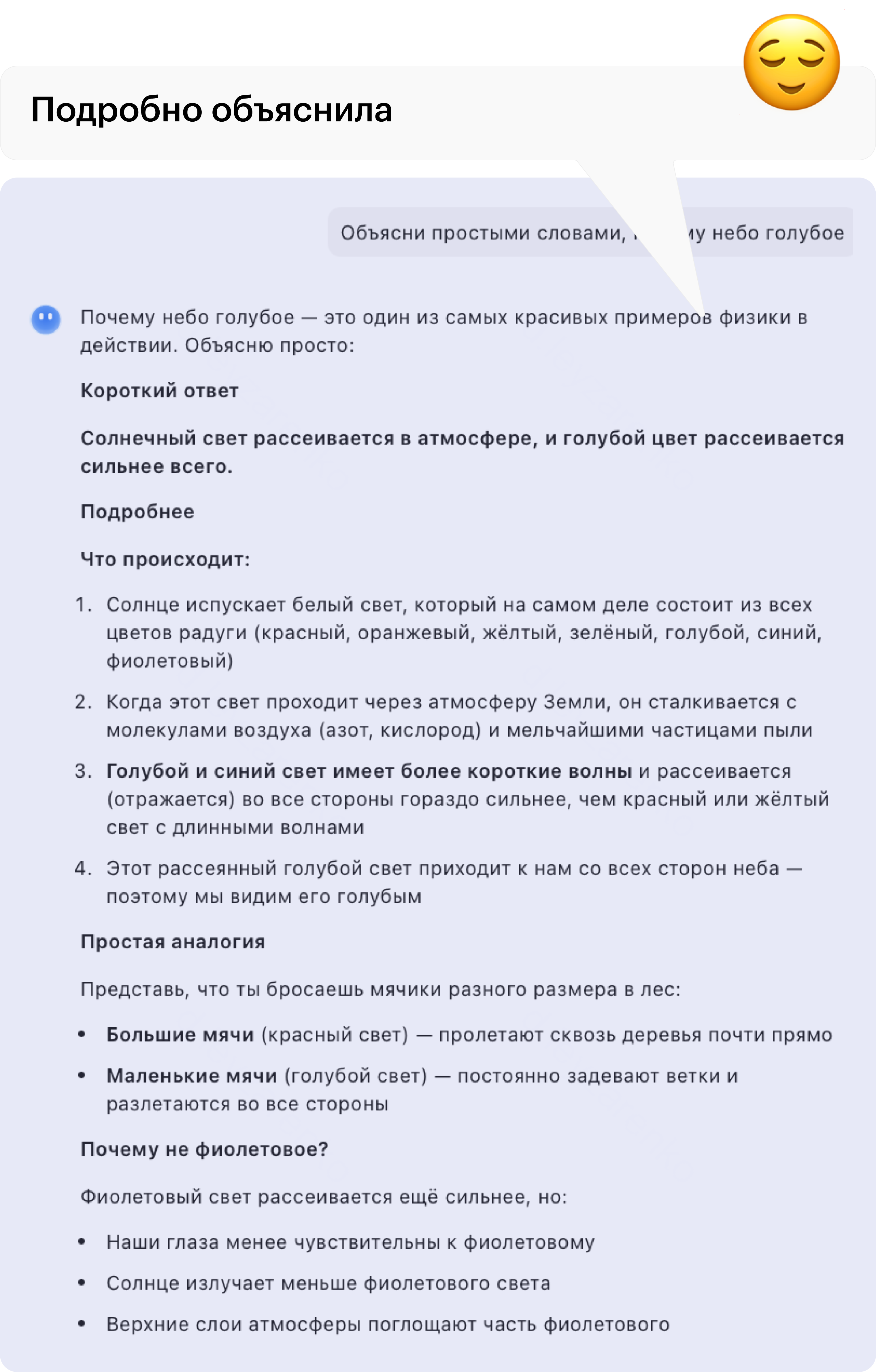 💬 Ответы на вопросы. Как и другие нейросети, Kimi умеет быстро генерировать тексты на простые запросы, например: «Объясни простыми словами, почему небо голубое». Чат-бот выдал структурированный ответ объемом около двух тысяч знаков. Сначала сделал краткую выжимку, потом выдал пошаговое объяснение. Даже добавил контекст про закаты, хотя я не просил. Все научно корректно. Чат-бот подойдет для базовых вопросов.