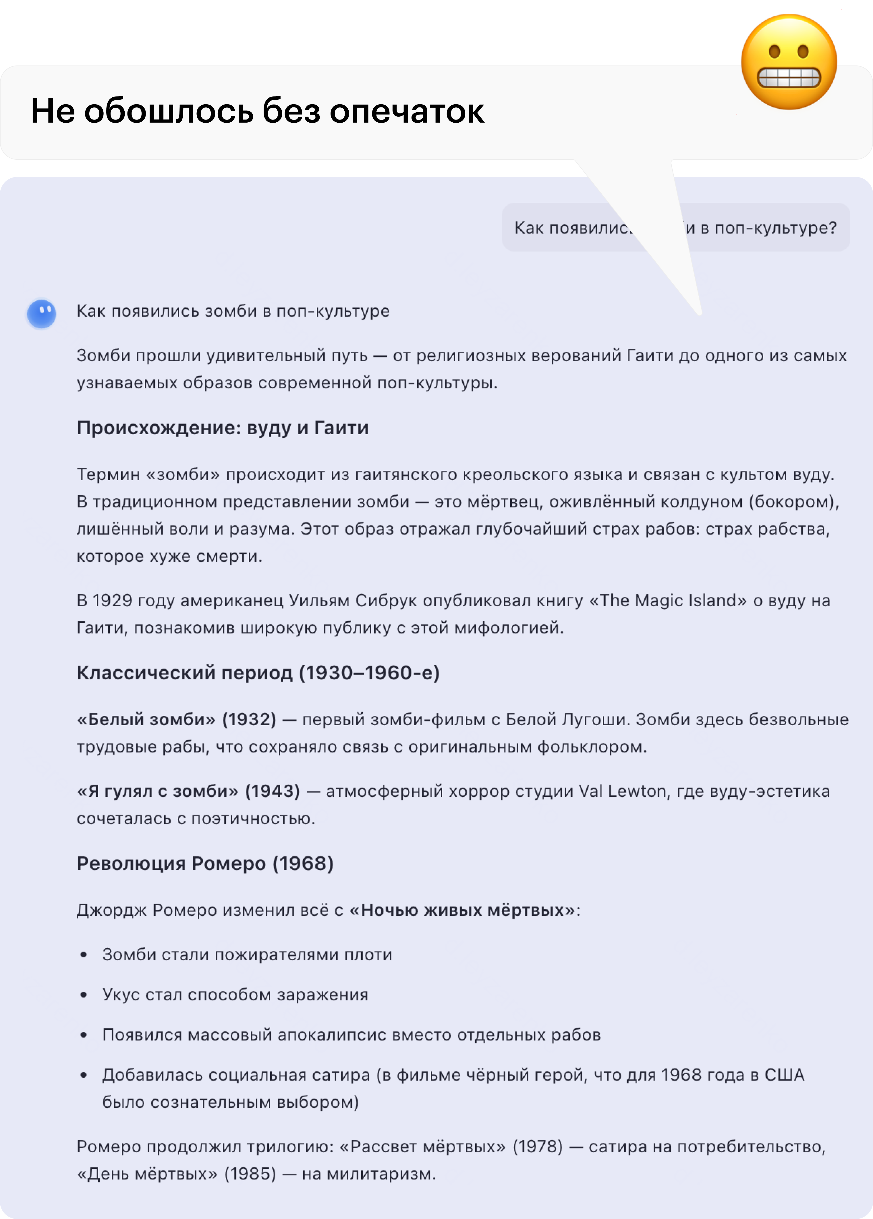 Но почему-то чат-бот неправильно перевел названия некоторых произведений. Например, должно быть «Я гуляла с зомби», а не «гулял». Главная героиня в этом хорроре — женщина. А фильм Джорджа Ромеро называется «Ночь живых мертвецов», а не «мертвых».