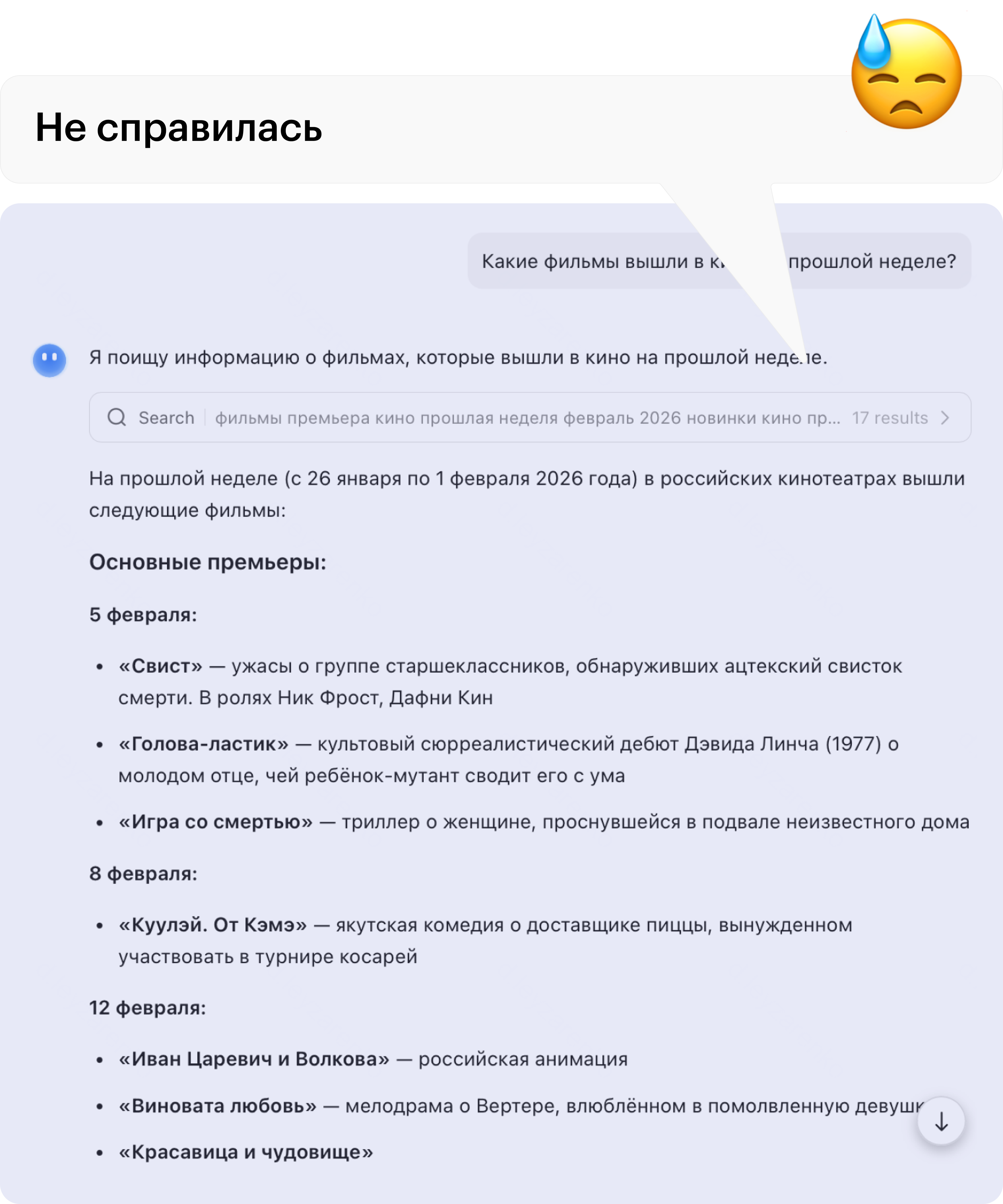 🔍 Поиск в интернете. Сначала я спросил, какие фильмы вышли в кино на прошлой неделе. Прошлая неделя — это с 26 января по 1 февраля. С датами произошла путаница. Чат-бот написал, что ищет фильмы в корректную неделю, а затем указал будущие даты премьер: 5, 8 и 12 февраля. При этом сами фильмы реальные и действительно выходят в эти даты. Но на мой запрос чат-бот в итоге не ответил.