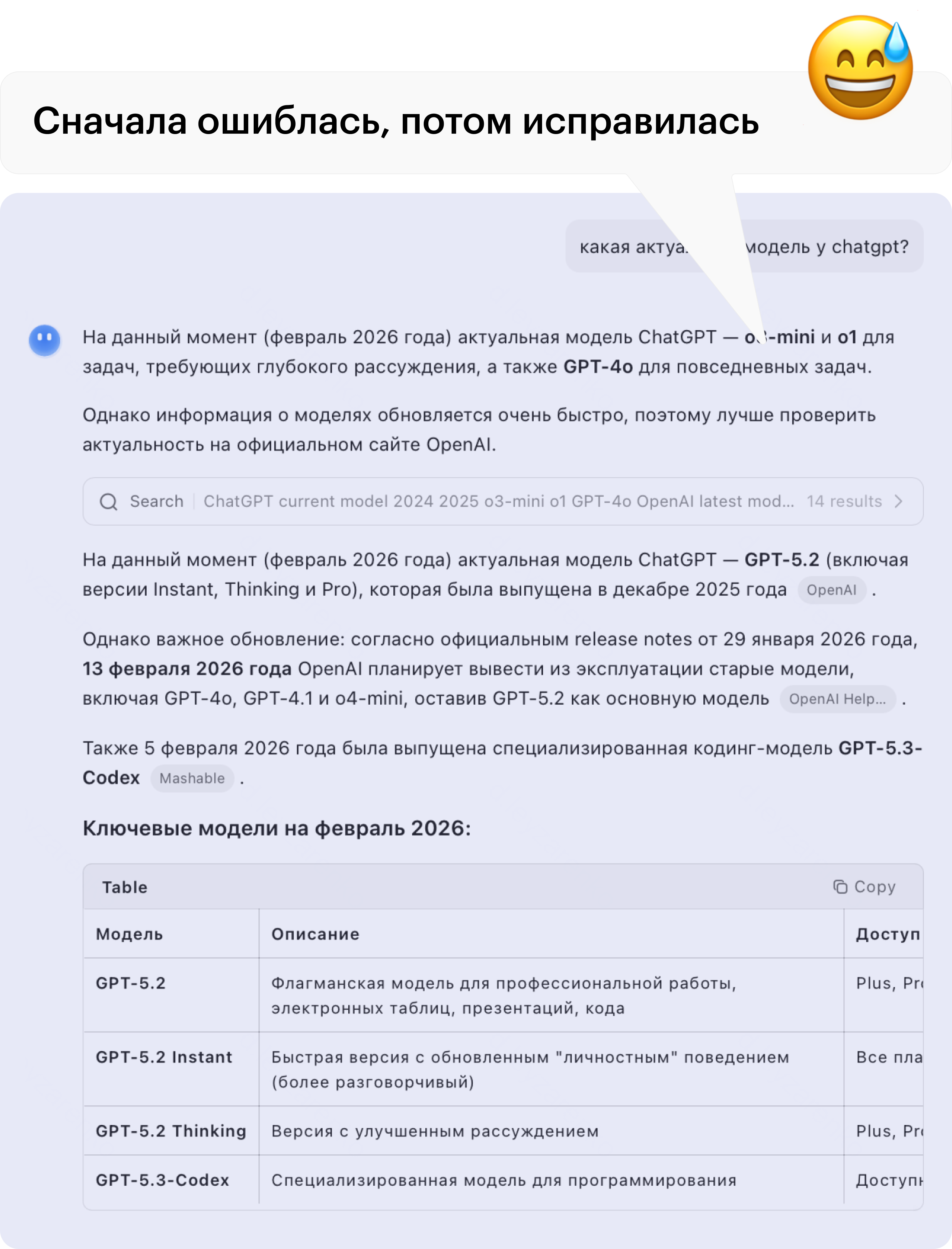 Потом я спросил про актуальные модели ChatGPT. Сначала Kimi почему-то выдала устаревшую информацию — назвала o3-mini, o1 и GPT-4o. Затем включила поиск, зашла на сайт OpenAI и исправилась. Актуальная модель сейчас — действительно GPT-5.2. Только непонятно, зачем чат-бот сначала дал старые данные: если бы я бегло читал ответ, так бы и запомнил. В общем, на поиск в Kimi я бы не полагался.