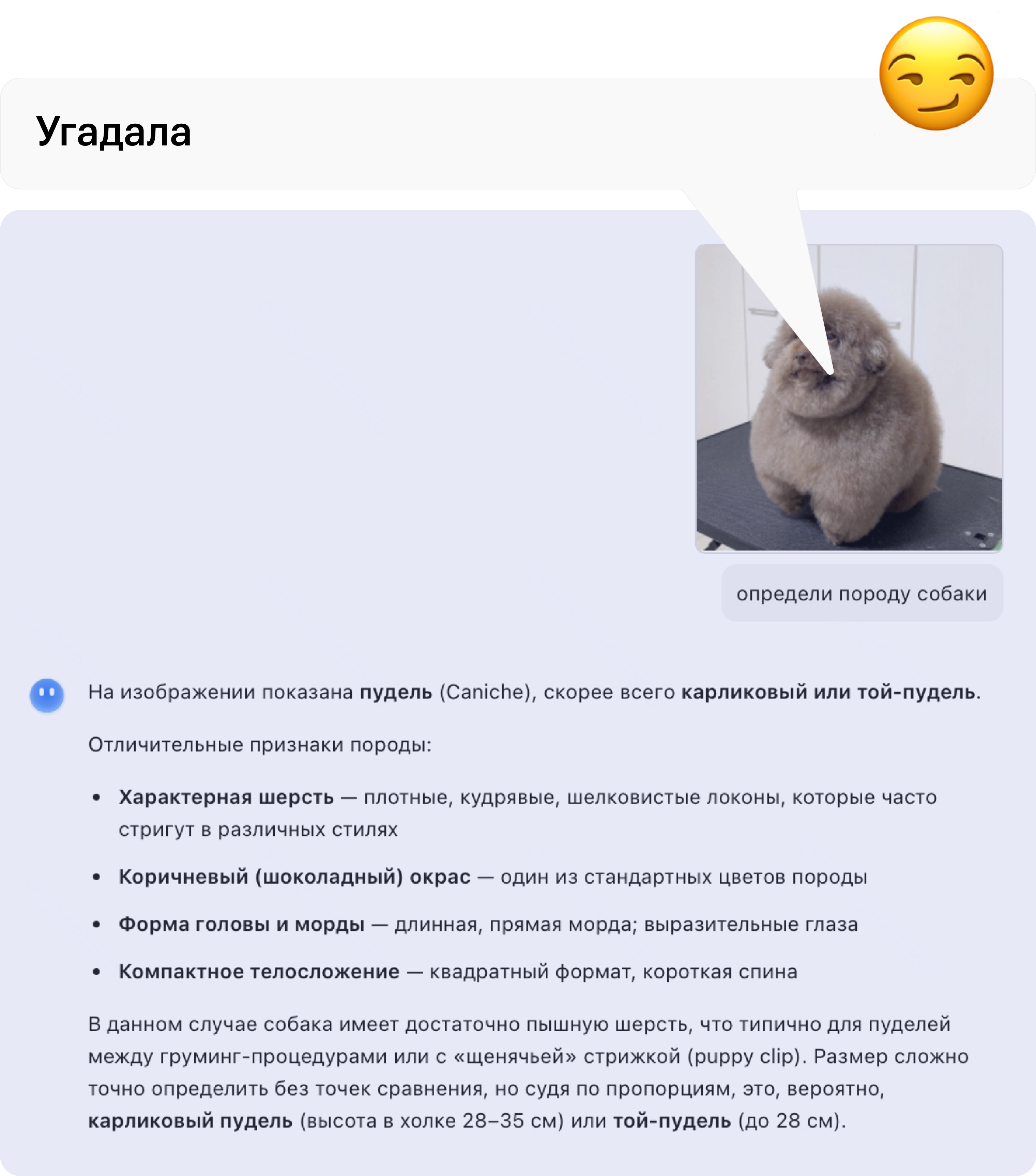 Я отправил фото мемной собаки Чиро и попросил определить породу. Нейросеть справилась с не самой очевидной задачей — это правда той-пудель. При этом она не поняла, что на картинке изображен известный пес, значит, действительно попыталась распознать породу, а не просто взяла информацию из интернета.