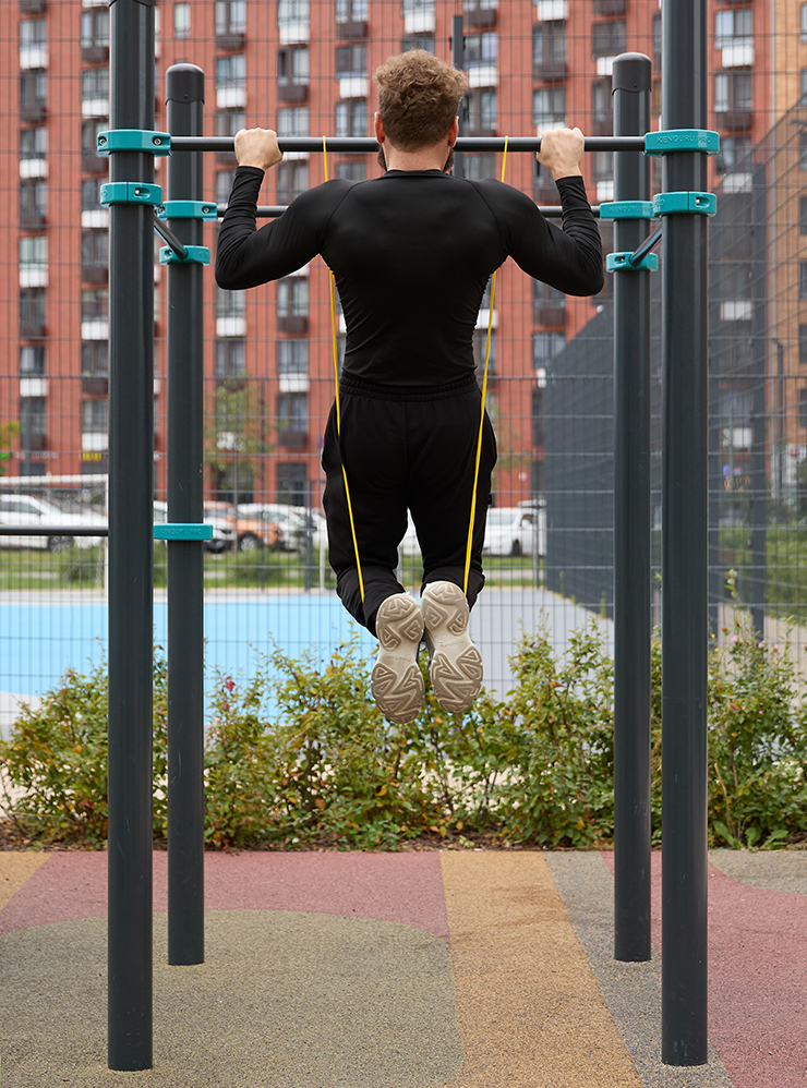 Резиновый эспандер, зафиксированный на перекладине, уменьшает нагрузку на мышцы при выполнении упражнения. Со временем и ростом силовых показателей резинку можно убрать и перейти к обычным подтягиваниям.