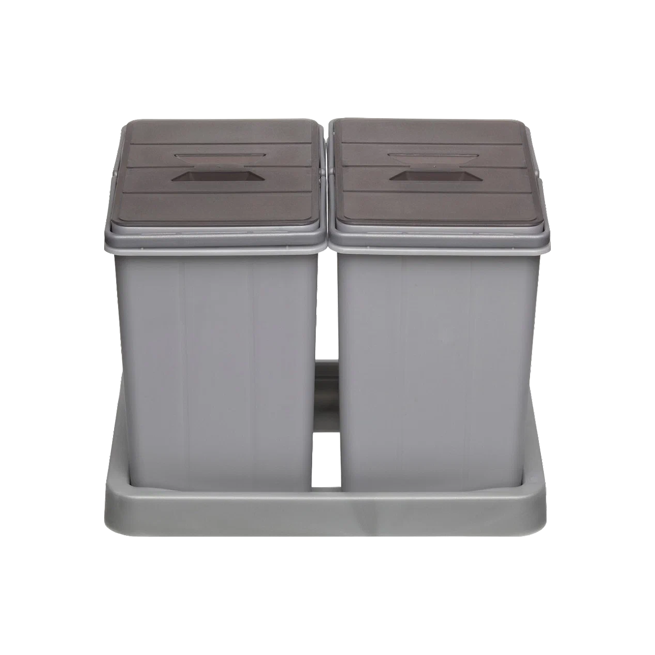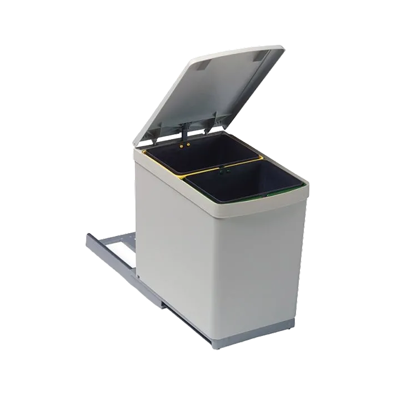 В комплекте два ведра по 15 л с крышками и две небольшие емкости — в них можно складывать, например, батарейки и другие мелкие отходы. Контейнеры сделаны из ударопрочного пластика. Все емкости можно поставить на общий поддон и разместить в выдвижном шкафу