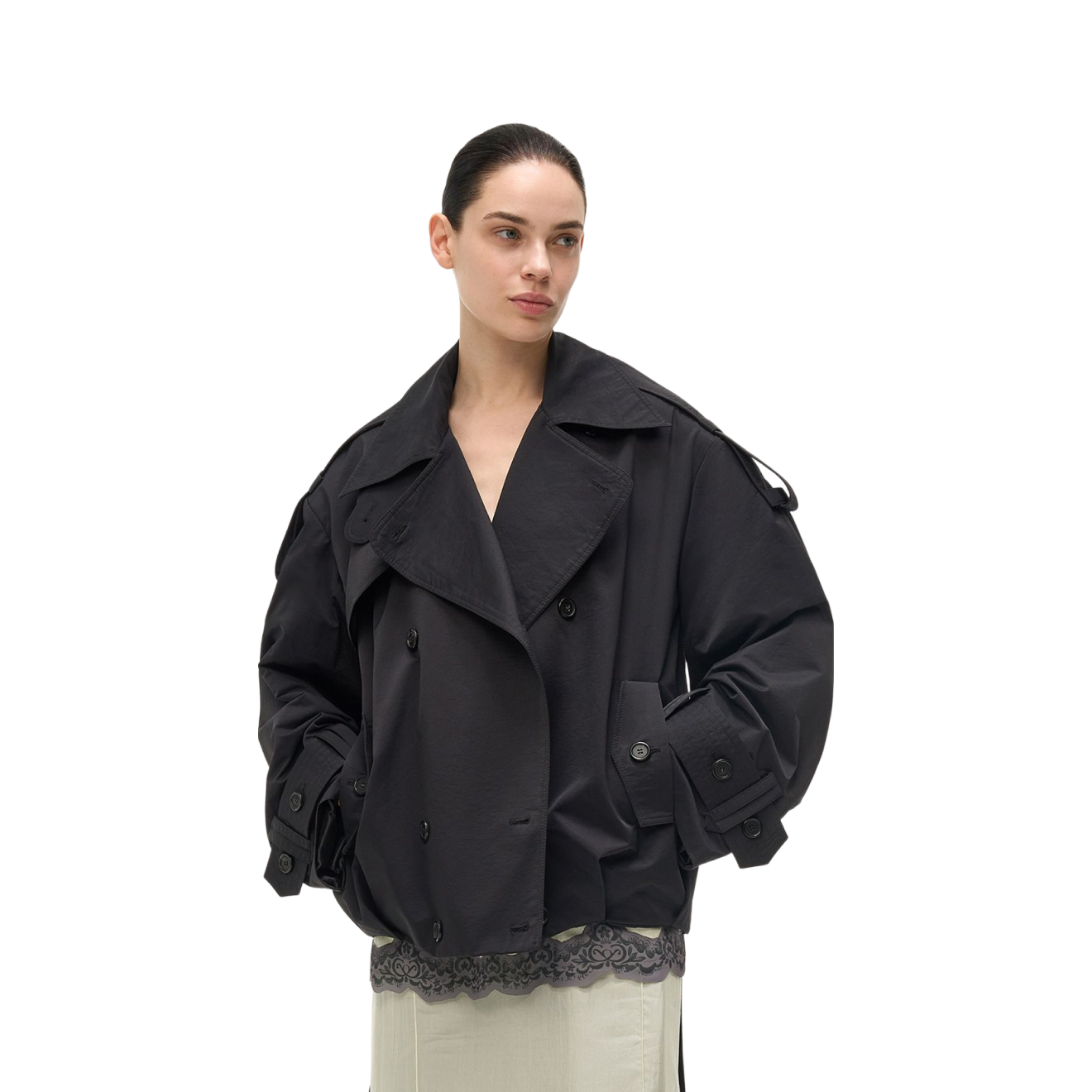 Поддерживаем объем другим объемом: в этом образе оверсайз-тренч уравновешивается «лесенкой» из кружевного топа, бельевой юбки и классических брюк в пол. Надеть к куртке вьетнамки морально решится не каждый, но можно подобрать альтернативу летним тапочкам среди весенних новинок обуви.