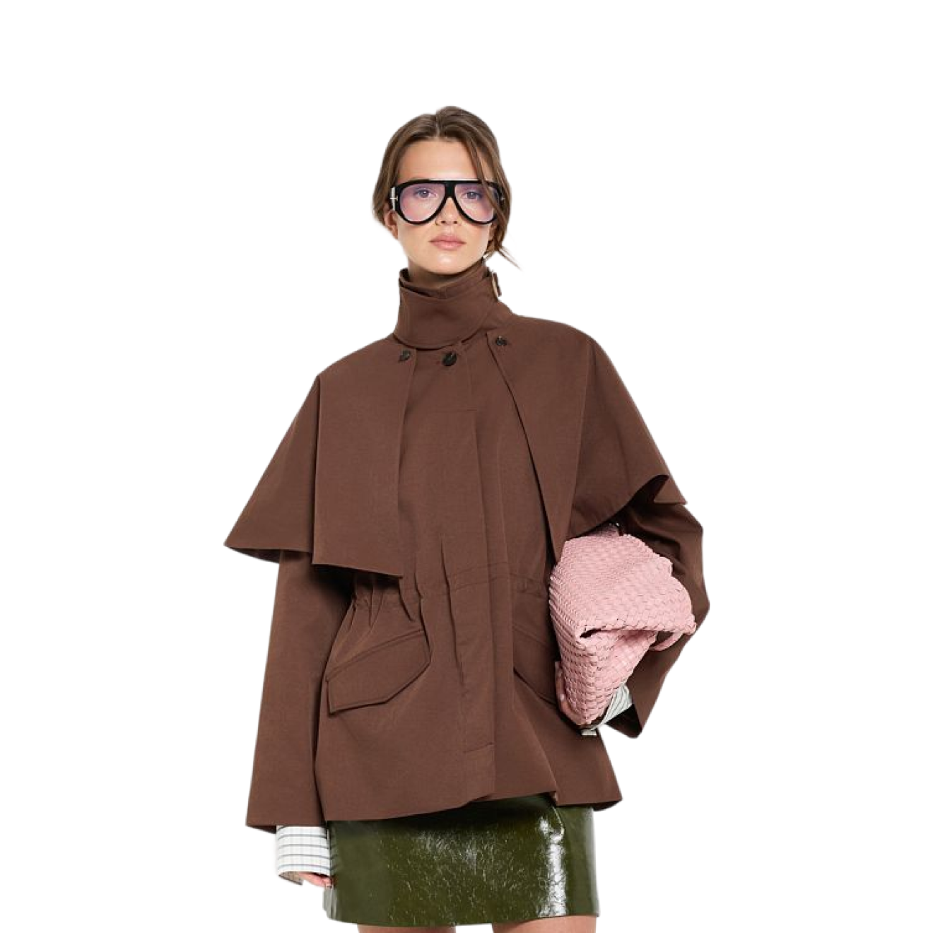 Такой тренч легко представить на ком-то из членов английской королевской семьи — на конюшне или на охоте, — и это настроение участвует в стайлинге. С одной стороны, глубокий зеленый оттенок и высокие сапоги с широким голенищем поддерживают буржуазное настроение образа. С другой — длина юбки, лаковая кожа и фигурная танкетка напрочь перечеркивают все вышесказанное.