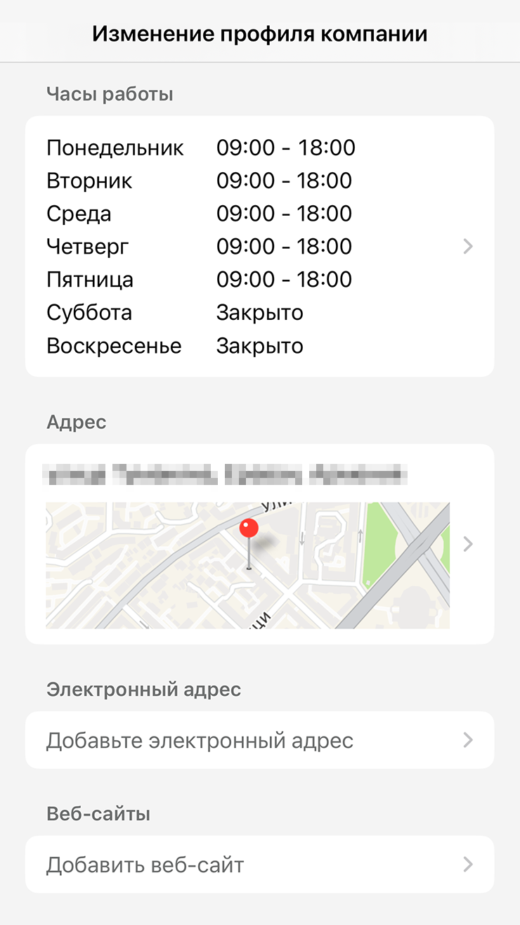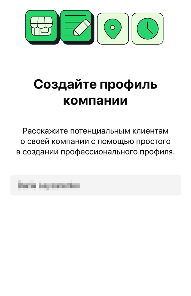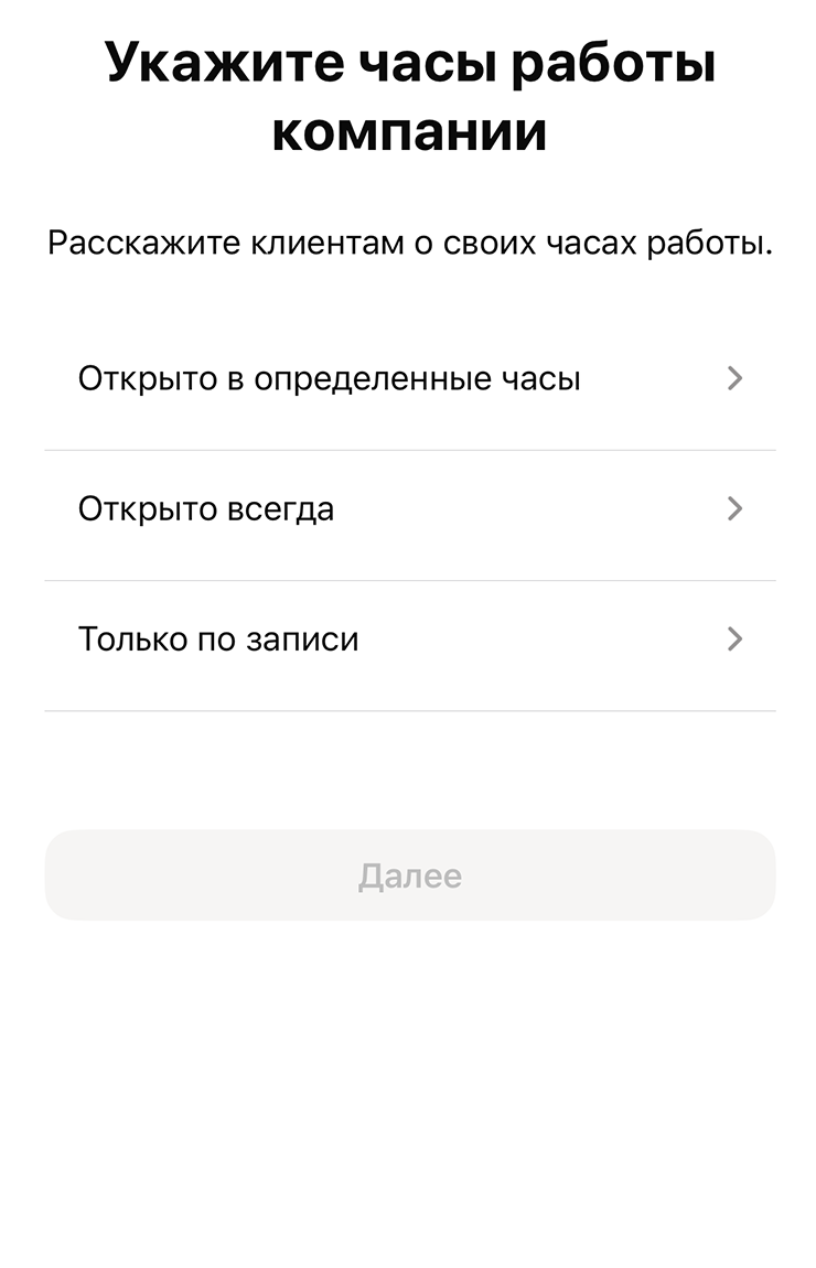 Шаг 3. Создайте профиль компании: укажите название, до трех видов деятельности и часы работы. Все данные можно будет изменить позже. Приложение также предложит добавить фото, адрес и сайт — эти сведения можно внести сразу либо пропустить шаги. Когда закончите, нажмите «Готово».