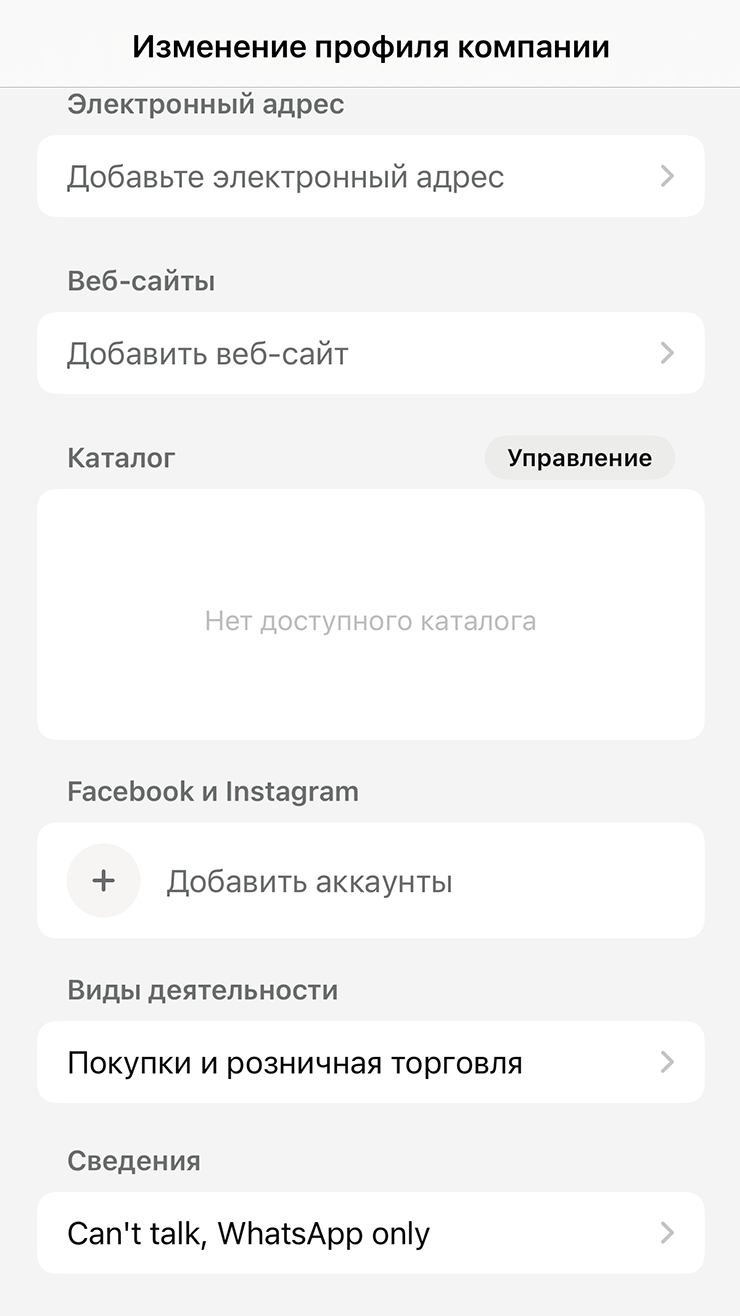 Профиль компании. Тут можно отредактировать название компании, номер телефона, описание, часы работы, а также добавить электронный адрес, сайт, каталог, привязать страницы в «Фейсбуке»* или «Инстаграме»*, указать виды деятельности, добавить описание профиля.