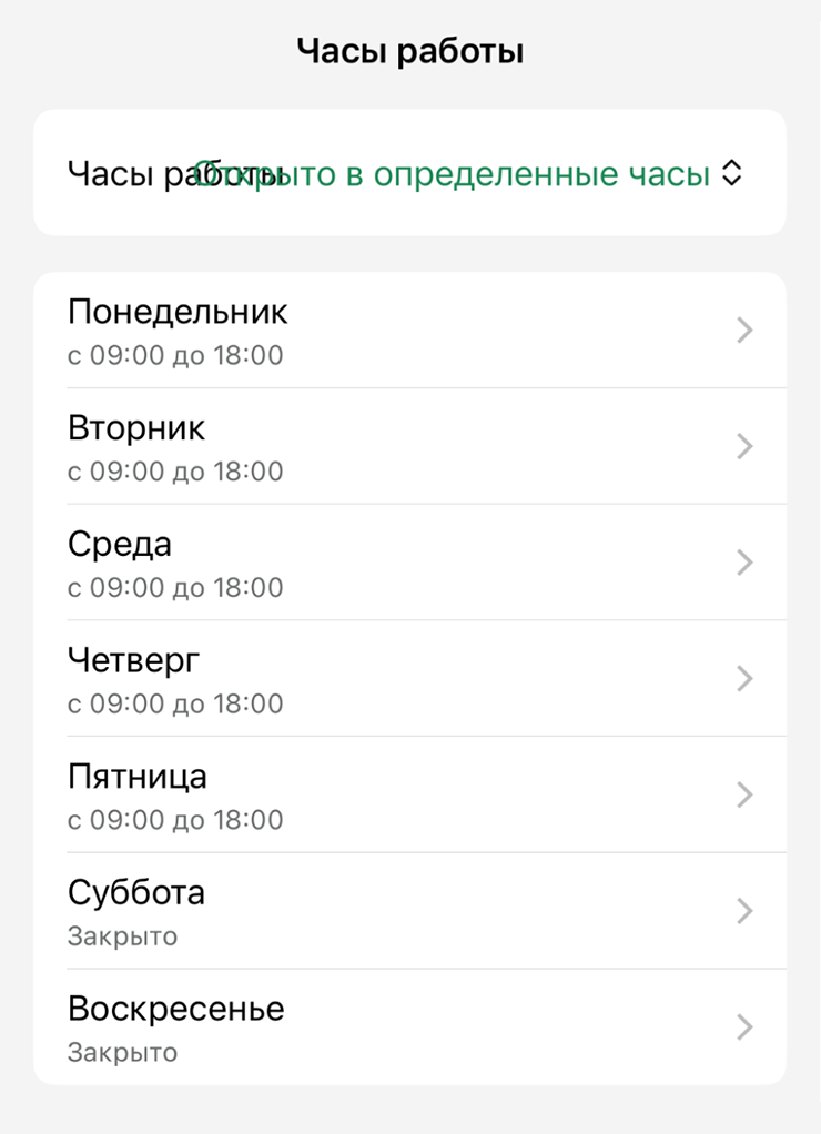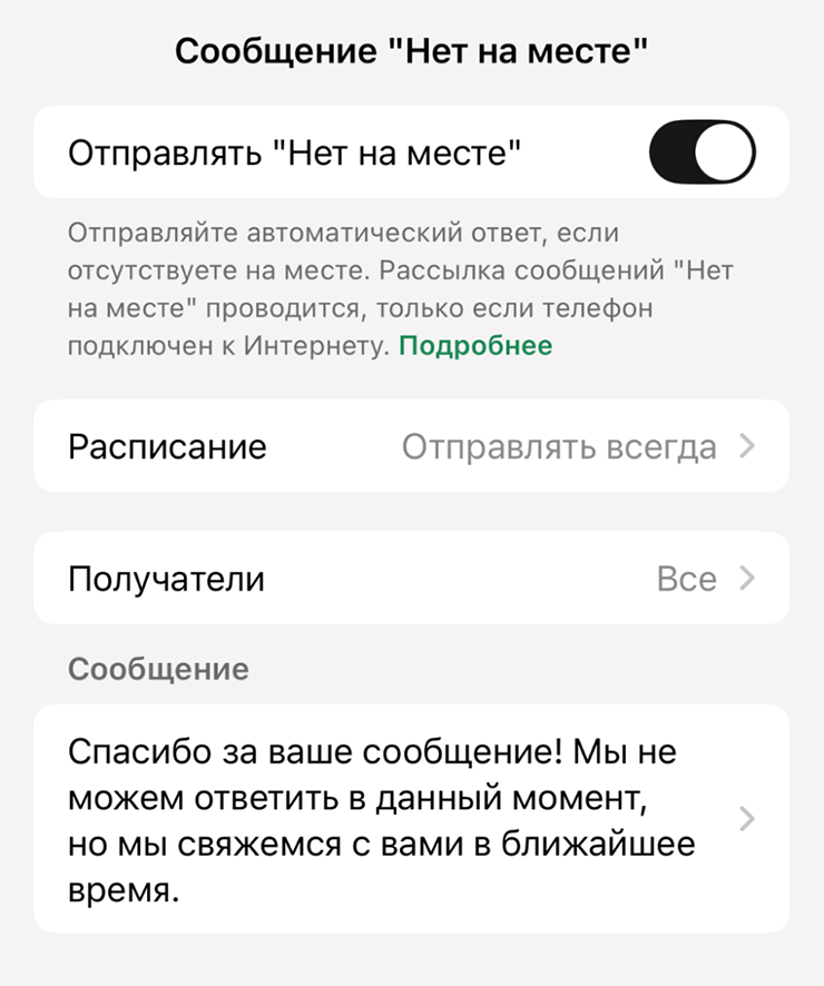 «Нет на месте» работает по тому же принципу, что и приветственное сообщение. Это автоматический ответ о вашем отсутствии, например в нерабочие часы или во время отпуска. Функция доступна, если в профиле компании указаны часы работы.