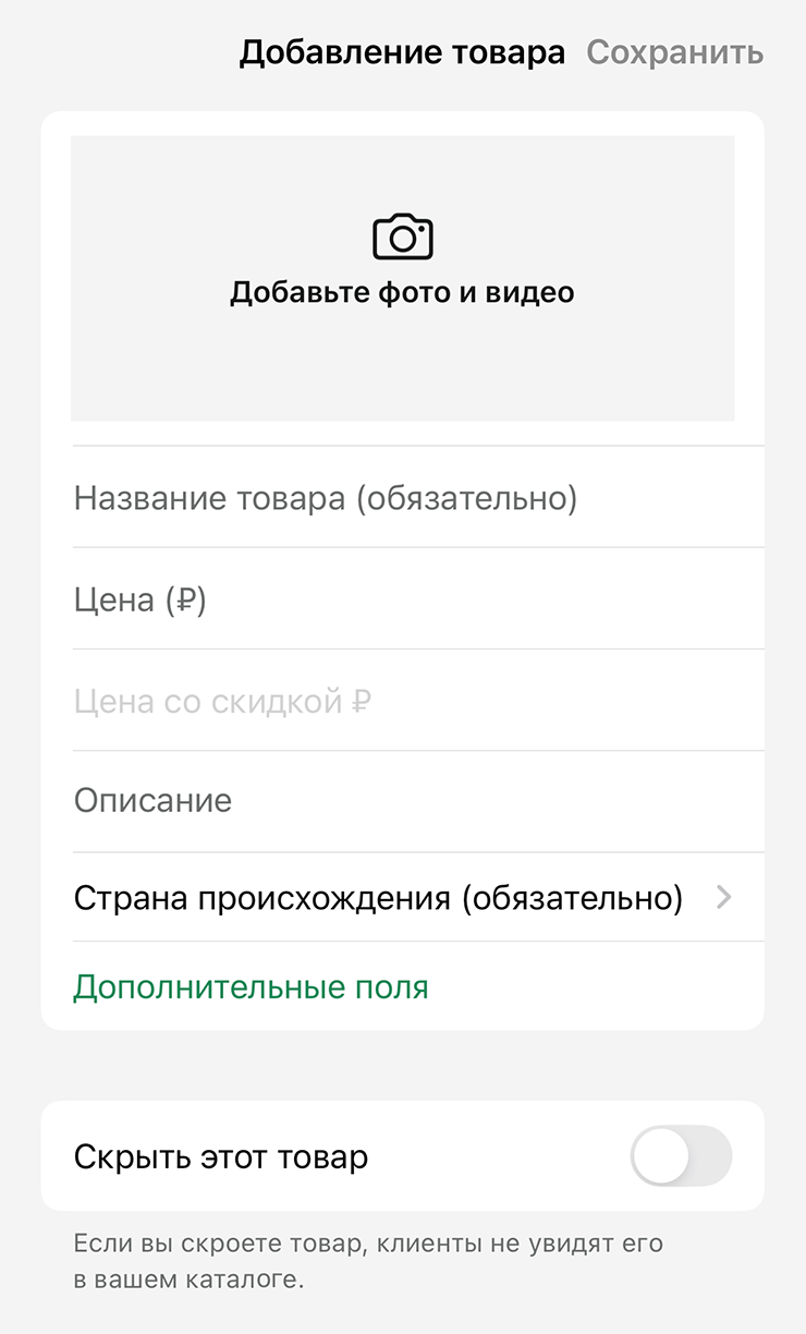 Чтобы сделать каталог, выберите соответствующую вкладку. Чтобы добавить новый товар или услугу, нажмите «Добавить новый товар». Загрузите изображение и заполните поля: название, цену, описание, страну происхождения. Можно также добавить ссылку или код товара. Каждый товар отправляется на проверку Meta* — это занимает около 24 часов.