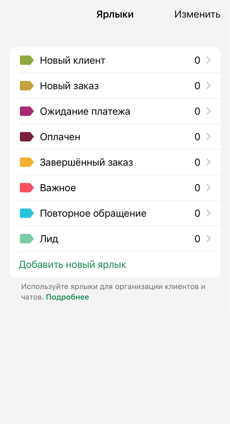 Ярлыки. Любому диалогу можно присвоить ярлык — например, «Ожидает платежа», «Заказ выполнен» и так далее. Это нужно, чтобы было проще ориентироваться среди большого количества диалогов и быстро находить нужные.
