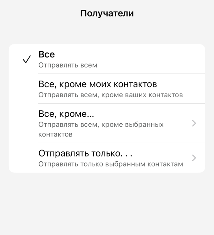 Укажите текст приветственного сообщения и выберите получателей: все, все, кроме ваших контактов, или все, кроме выбранных контактов. Это удобно, если вы не хотите отправлять сообщение тем, с кем уже общались.