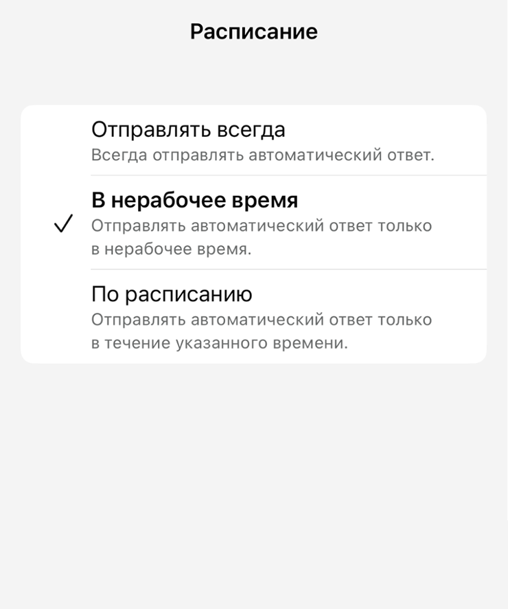 Сообщение получат только те, кто напишет вам в этот период. Чтобы оно не отправлялось коллегам или друзьям, можно настроить исключения, как для приветственного сообщения.