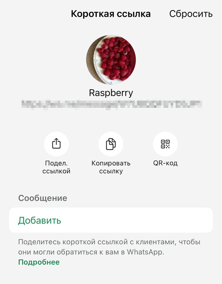 После создания аккаунта короткая ссылка формируется автоматически. Найти ее можно в разделе «Инструменты» → «Короткая ссылка». Ею можно поделиться, скопировать или сгенерировать QR-код на ее основе. Также вы можете добавить текст, который клиент будет отправлять вам при открытии ссылки.