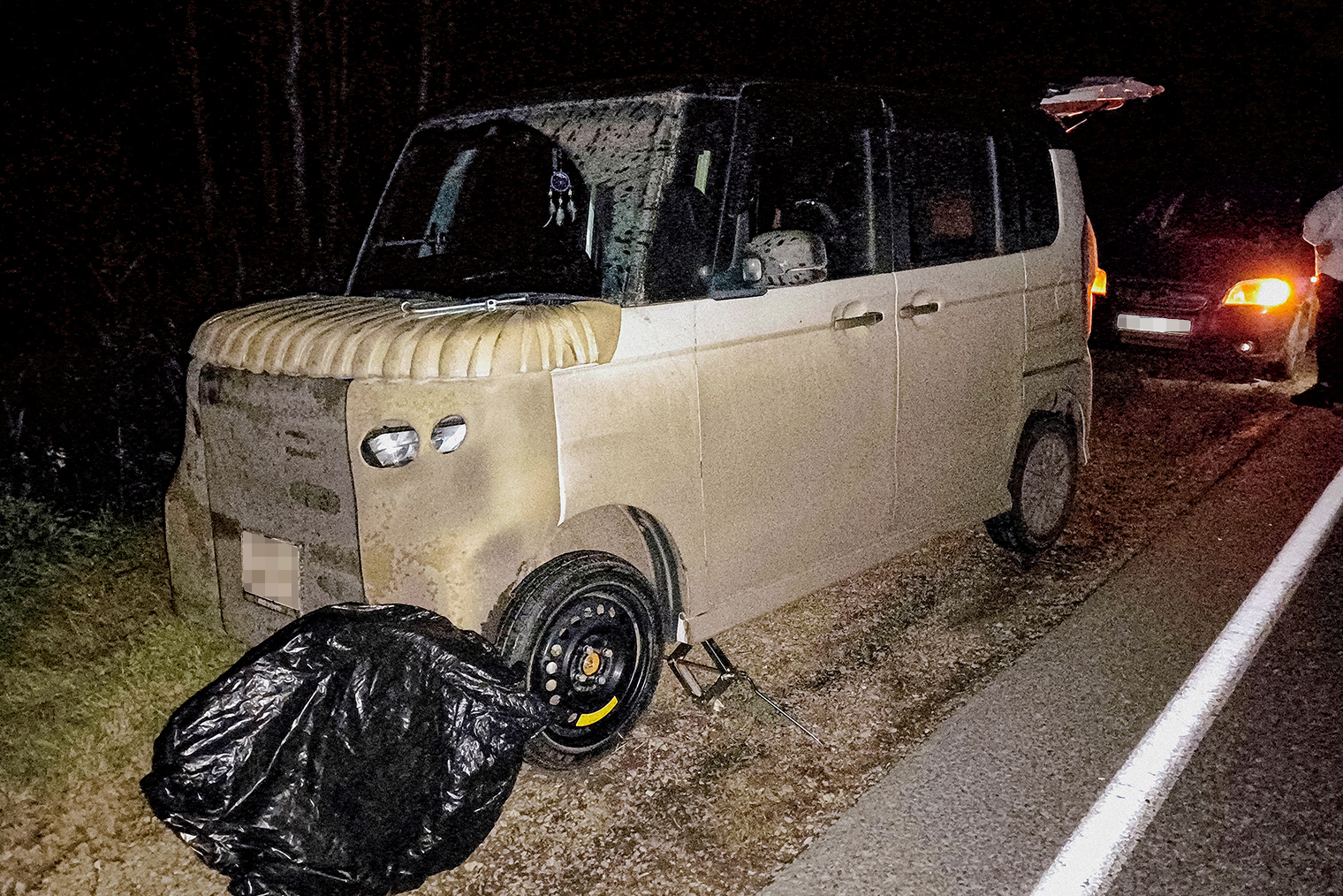 Ночью на трассе под Екатеринбургом я пробил колесо, пригодилась докатка. Из-за этого пришлось купить за 8 000 ₽ еще четыре новых колеса редкого размера 165/55 R15 в Каменске-Уральском. Я пробил одно колесо, но их продавали только комплектом. Пришлось брать: доставка заняла бы около недели.