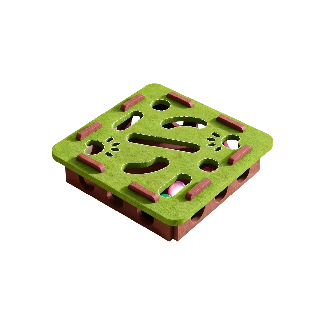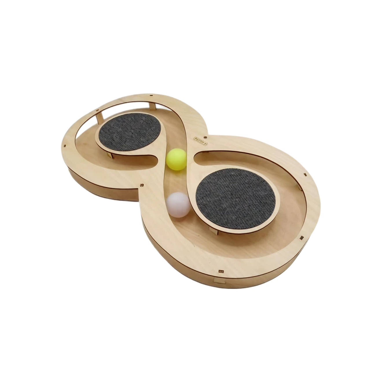 Основа — фанерная восьмерка с желобом, по которому перемещаются шарики. Сверху есть две когтеточки из ковролина. Эксперт считает, что игрушка помогает кошке больше двигаться и оставаться в хорошей физической форме. Но важно следить за индивидуальными реакциями животного. Некоторых может фрустрировать невозможность вытащить мячик. Если питомец будет раздражаться, возможно, игрушка ему не подходит