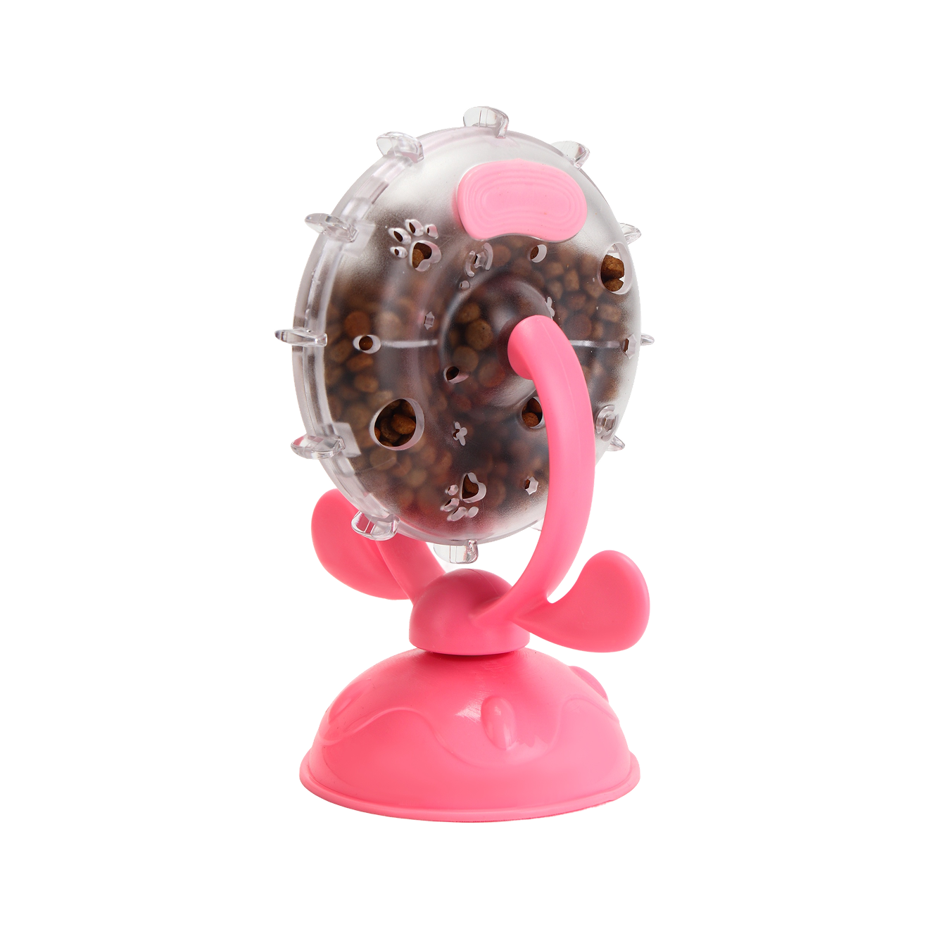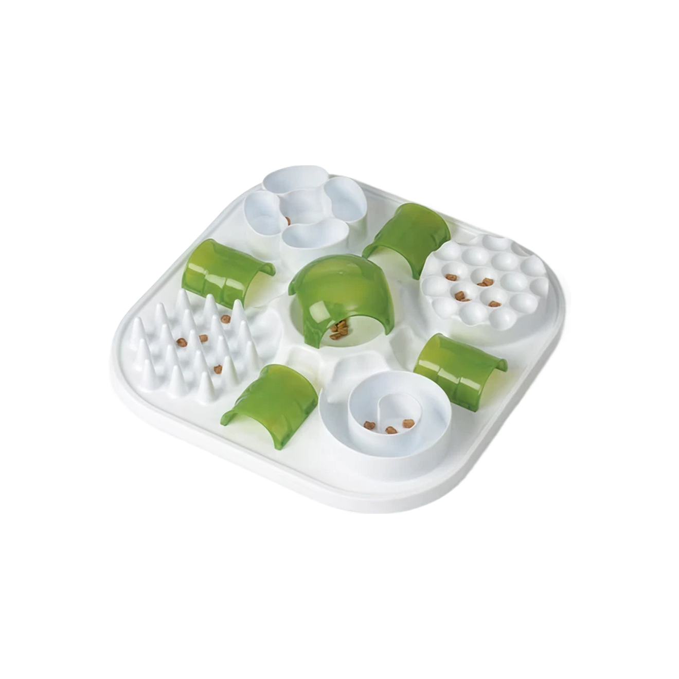 На прочной пластиковой основе — шесть мини-локаций для сухих угощений. Это цветок, спираль, пирамидальный лес, пещера, пузыри, тоннели. Кошка видит или чует корм, но его не так просто достать из углублений. Животному придется сообразить, как добыть угощение. Конструкцию легко разбирать и мыть. По словам зоопсихолога, скорее всего, эта игрушка подойдет большинству питомцев