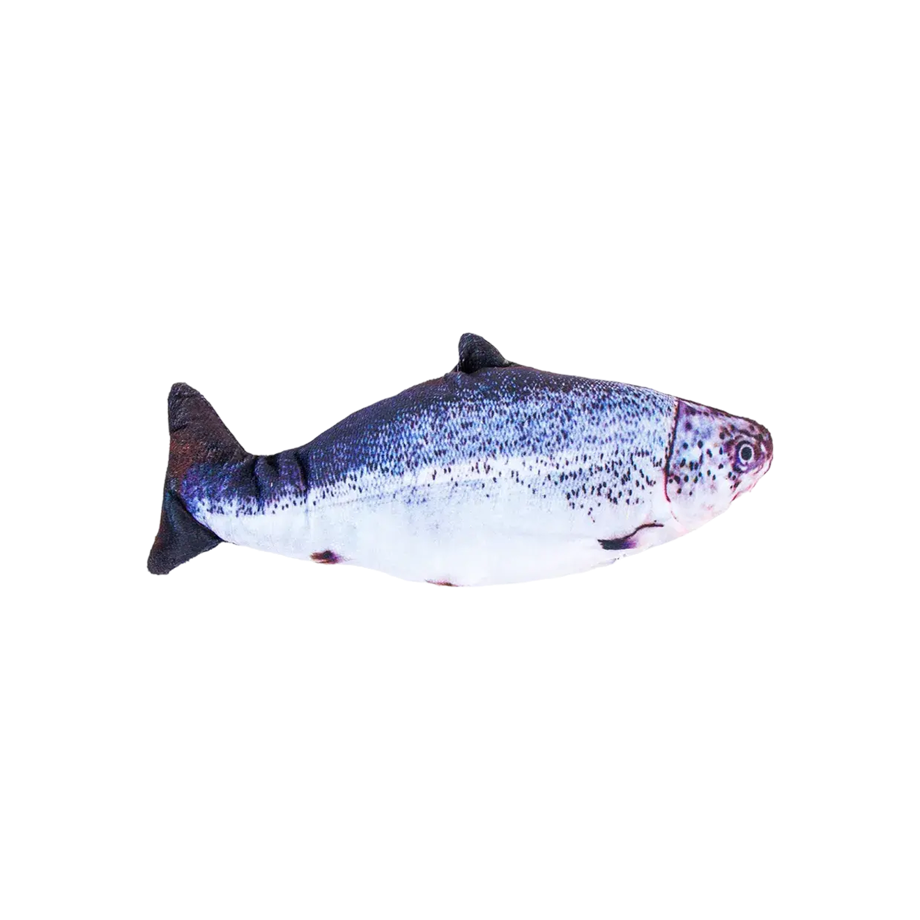 Длина форели 30 см. Зоопсихолог считает, что такие игрушки стоит давать крупным и уверенным в себе животным, размеры которых значительно больше. У рыбы мягкий корпус. Когда игрушка включена, она реагирует на прикосновение питомца и начинает двигать хвостом. Игрушка заряжается с помощью USB-кабеля