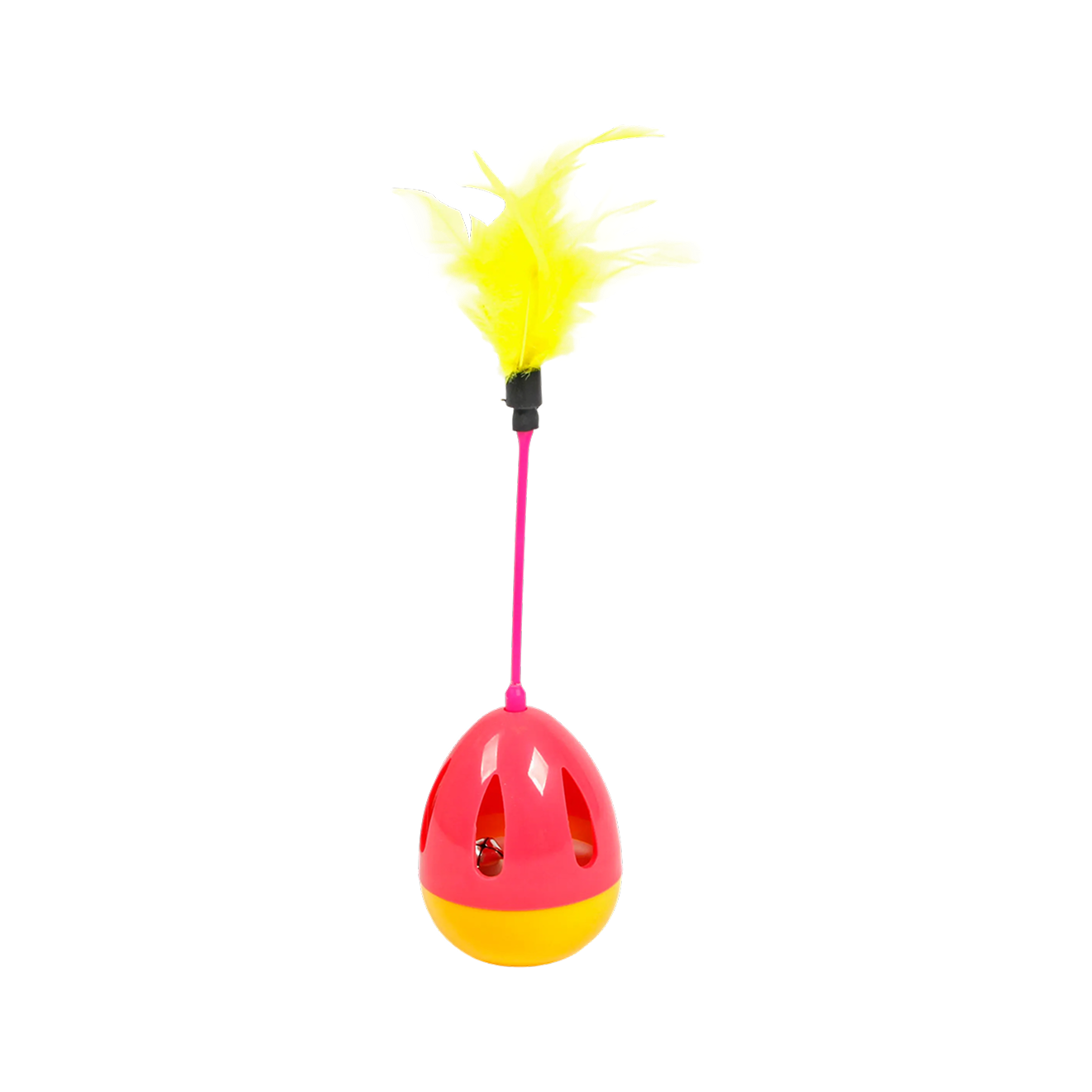 Кошка охотится за пером и наклоняет игрушку, но неваляшка все время возвращается в вертикальное положение. Внутри корпуса звенит бубенчик. Все это мотивирует животное играть и больше двигаться. Высота игрушки 28 см, с ней могут справиться чуть подросшие котята и взрослые животные