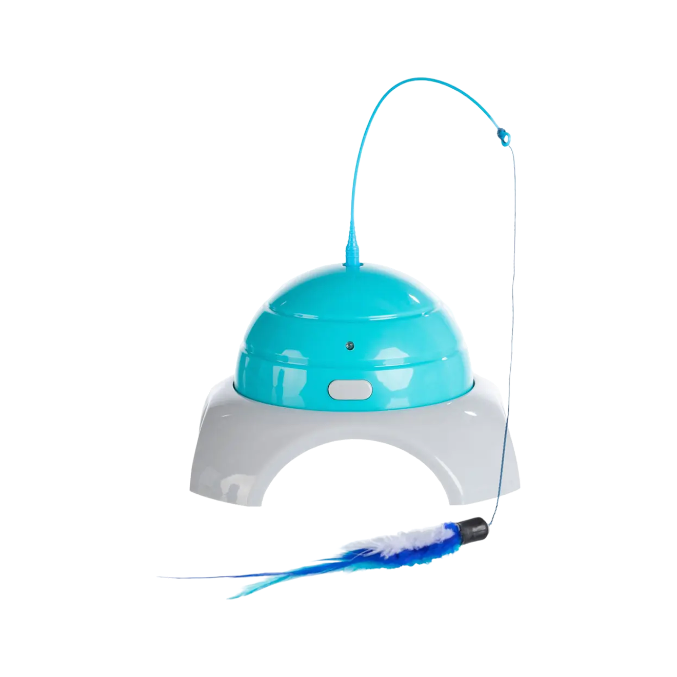 Интерактивная дразнилка на батарейках. Мотор раскручивает удочку, перо вращается, кошка гоняется за добычей. Батареек в комплекте нет, зато есть запасная удочка. Игрушка подходит для котят и небольших животных. Крупный питомец может уронить конструкцию