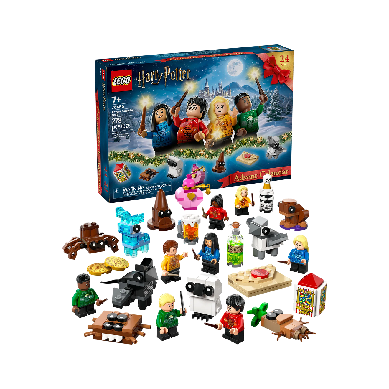 В комплекте не только конструктор, но и продуманная площадка для игры — это сама упаковка адвента. Спереди расположены 24 окошка, в которых спрятаны фигурки героев и знаковые атрибуты из «Гарри Поттера». На задней части календаря — коврик, где можно расставить игрушки